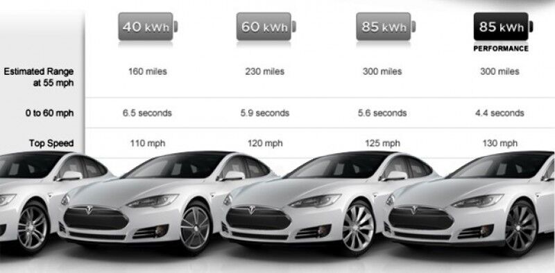 Todas las baterías del Model S serán de iones de litio, pero se podrá elegir entre 3 capacidades: la más económica lleva unas baterías de 257 km de autonomía, de 42 kWh de capacidad, la versión intermedia 370 km y la versión más cara tendrá una paquete de baterías mayor y una autonomía de 483 km.
