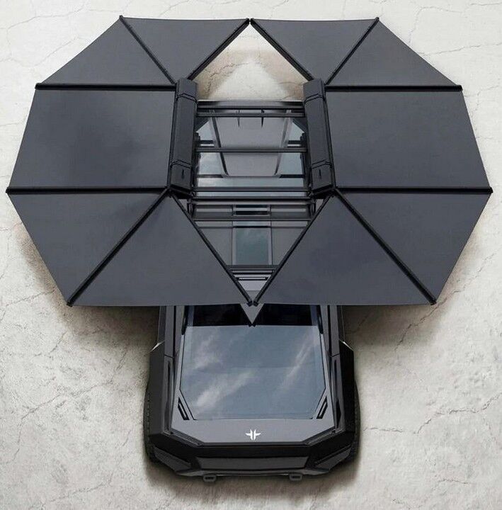 De hecho, el toldo la camioneta viene con una especie de alas de murciélago desplegables que son paneles solares. ¿De qué sirve una buena camioneta si puede ir a cualquier parte del globo pero se queda sin batería tan pronto como llega? La ansiedad por la autonomía se maneja de manera efectiva por medio de este sistema de paneles solares, generando energía a la batería y ayudando a hacer funcionar los electrodomésticos y demás equipo de a bordo cuando están estacionados. En climas con muchas horas de sol, es energía prácticamente infinita.