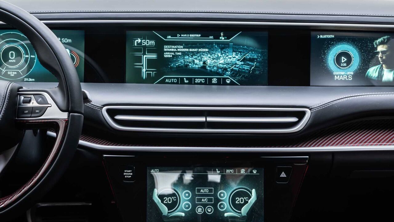 El habitáculo de los TOGG pretende ser muy avanzado tecnológicamente y apuesta por la digitalización. Hay hasta seis pantallas, dos para los retrovisores, una instrumentación digital, dos para el infoentretenimiento en la parte central e incluso una para el copiloto. La consola central también destaca por su diseño asimétrico, mientras que la calidad parece buena a priori. También destacará la habitabilidad gracias a la generosa distancia entre ejes.