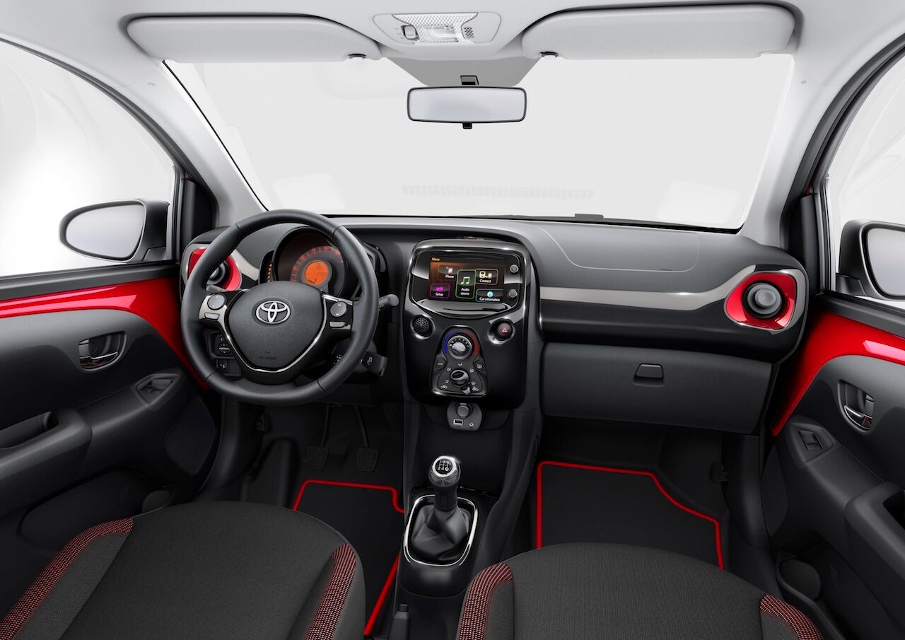 En el habitáculo, el nuevo Aygo x-cite cuenta con tapicería de piel, salpicadero y consola central en color negro y embellecedores de las salidas del sistema de climatización y alfombrillas con ribete en rojo. Además, el modelo cuenta con una pantalla táctil de 7 pulgadas, cámara de visión trasera, climatizador manual y luces diurnas LED.
