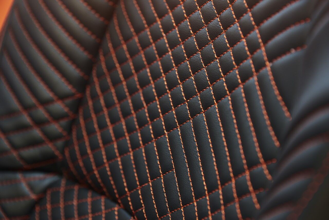 En el interior continúan las modificaciones con el mismo patrón de colores. Estrena unos vistosos asientos con tapicería de cuero negro y las costuras en naranja formando diamantes. Esta combinación también se extiende hasta los paneles de las puertas y reposabrazos. La franja que cruza el salpicadero, que encuadra la pantalla táctil de 8 pulgadas y que en modelo original es de color azul, en este caso de tiñe de naranja.
