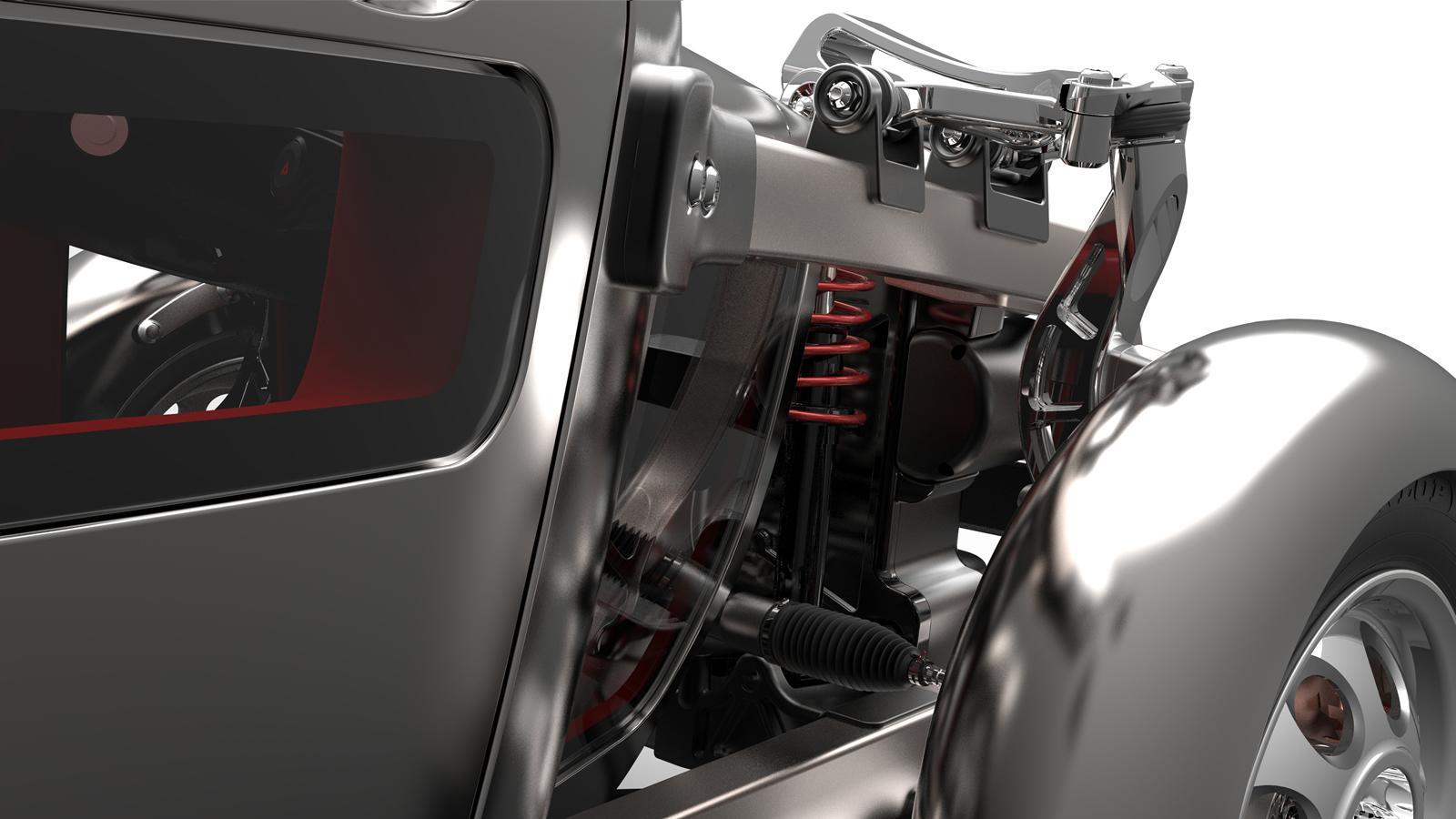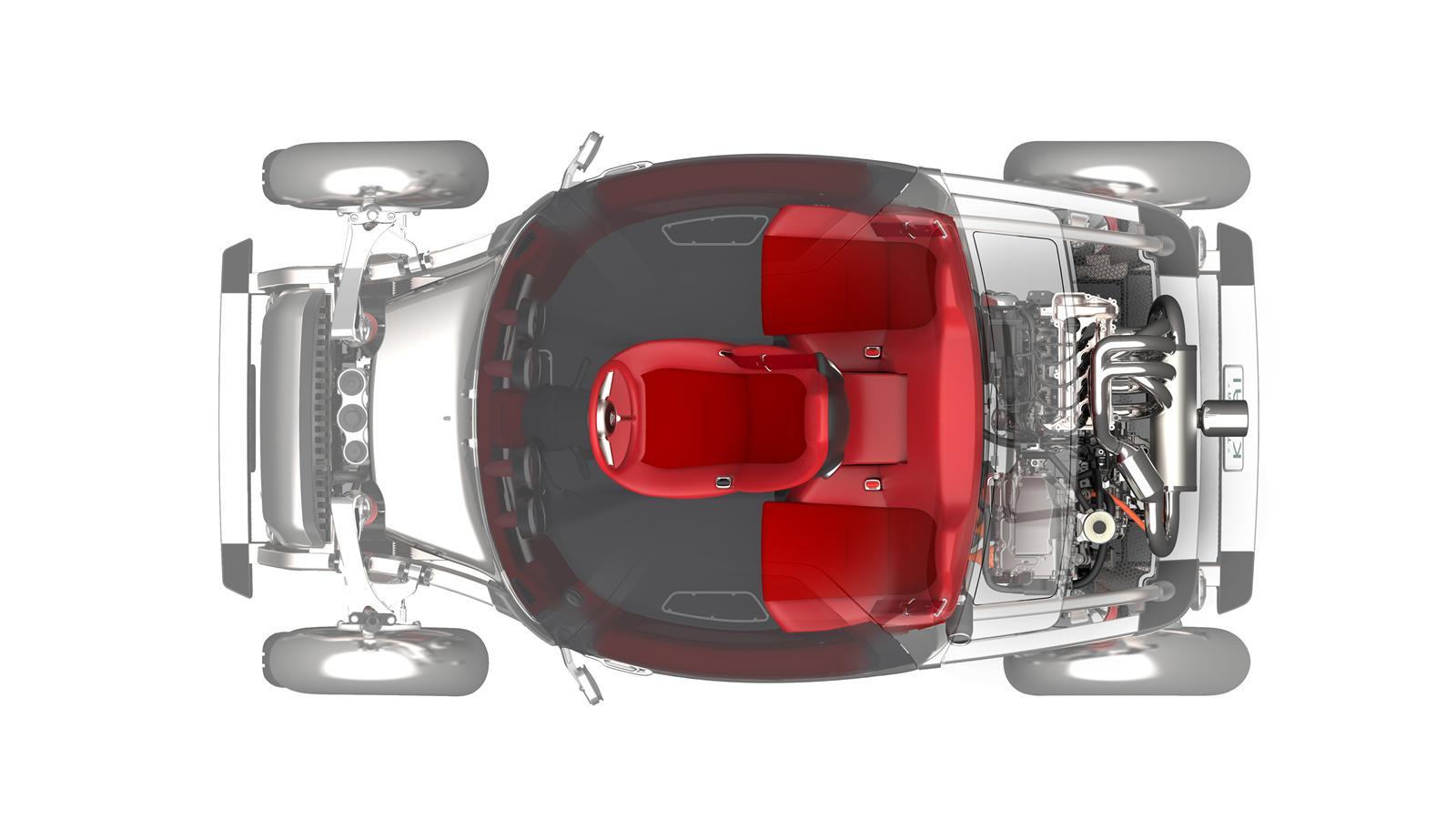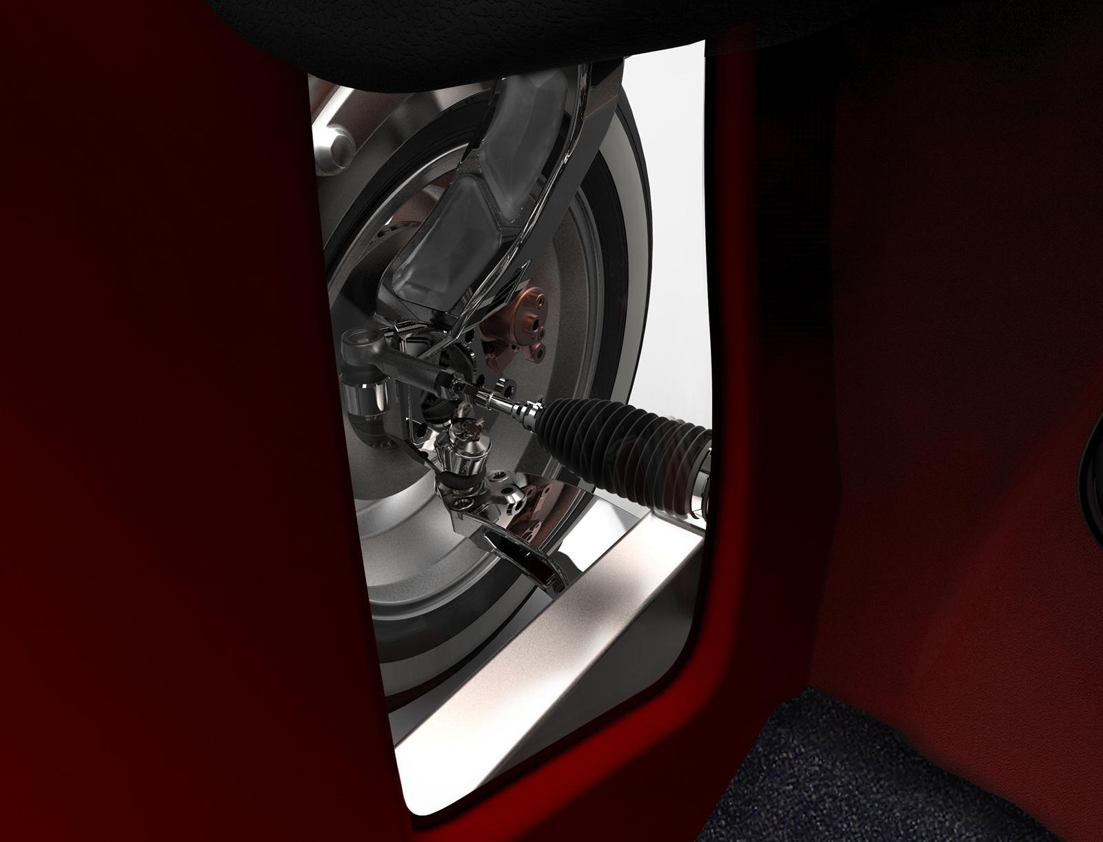 Hay otra ventanilla más, a los pies del conductor, para ser consciente de los movimientos de los neumáticos y la suspensión y ver cómo se aumenta la velocidad por la superficie de la vía. Y por el parabrisas, se observan también los movimientos del brazo que lo acciona. Todo se ha pensado en la misma dirección: que cada movimiento del coche, cada detalle sea percibido directamente, sin interfaces digitales, sino por mecánica pura.