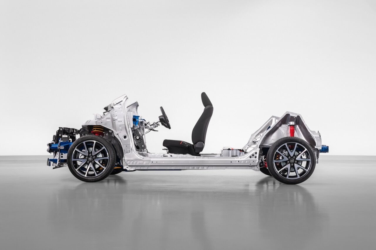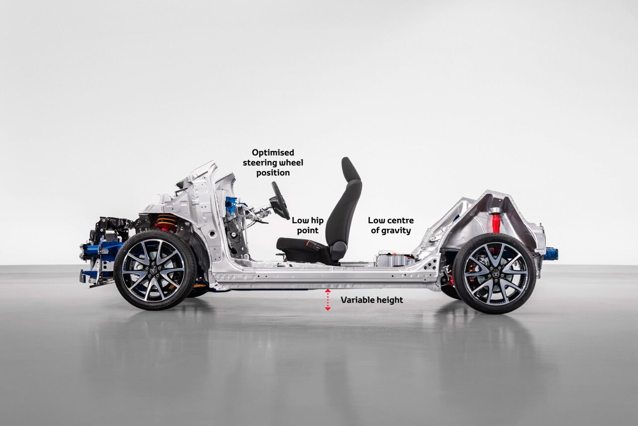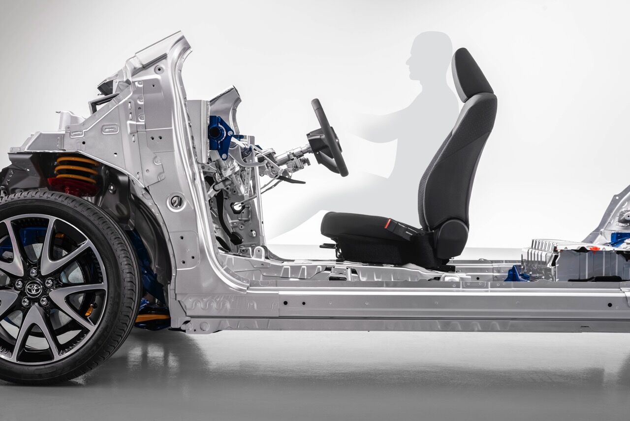 La plataforma GA-B de Toyota cuenta con un centro de gravedad bajo gracias a la posición del asiento del conductor, cercano al suelo y bastante centrado. Porque el espacio interior también ha sido un aspecto que se ha cuidado mucho. Se ha dejado bastante libertad para que los diseñadores puedan crear carrocerías llamativas y habitáculos amplios sobre esta arquitectura. Parece que la distancia entre ejes está bastante extendida, así que podríamos esperar que los voladizos sean cortos.