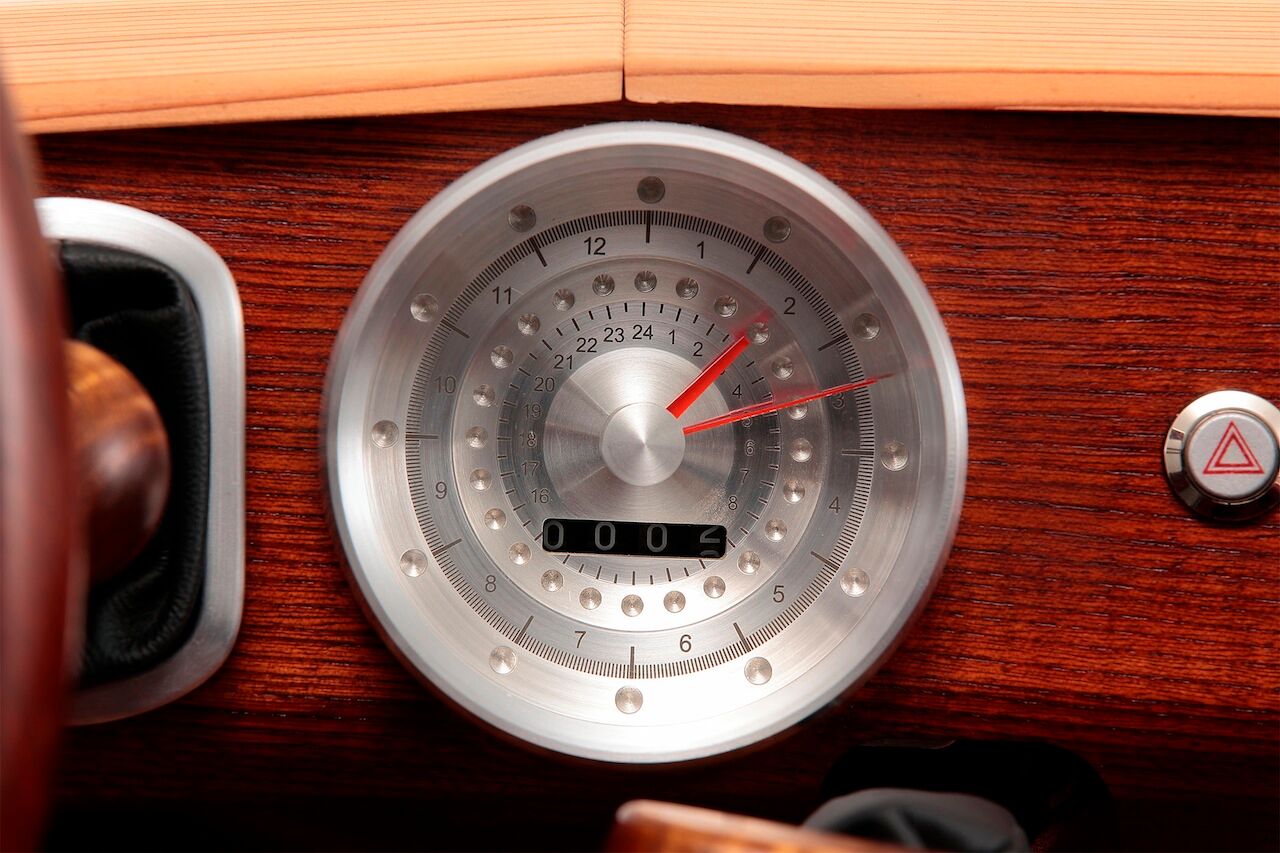 ¿Un reloj? Sí, pues la manecilla corta de la esfera de aluminio del indicador marca la hora el día (una vuelta son 24 horas), mientras que la larga muestra el paso de los días (una vuelta es un año). El contador no mide los kilómetros recorridos, sino los años que pasan desde que llega a una familia. Cada cumpleaños del coche se celebrará como el de cualquier otro miembro de la misma, ¿no crees?