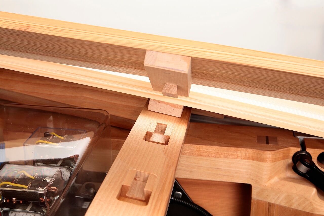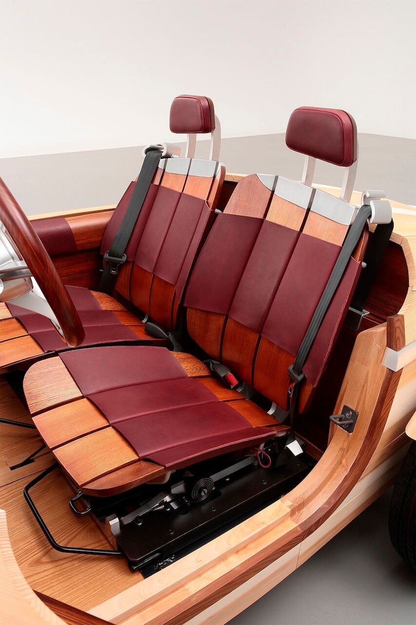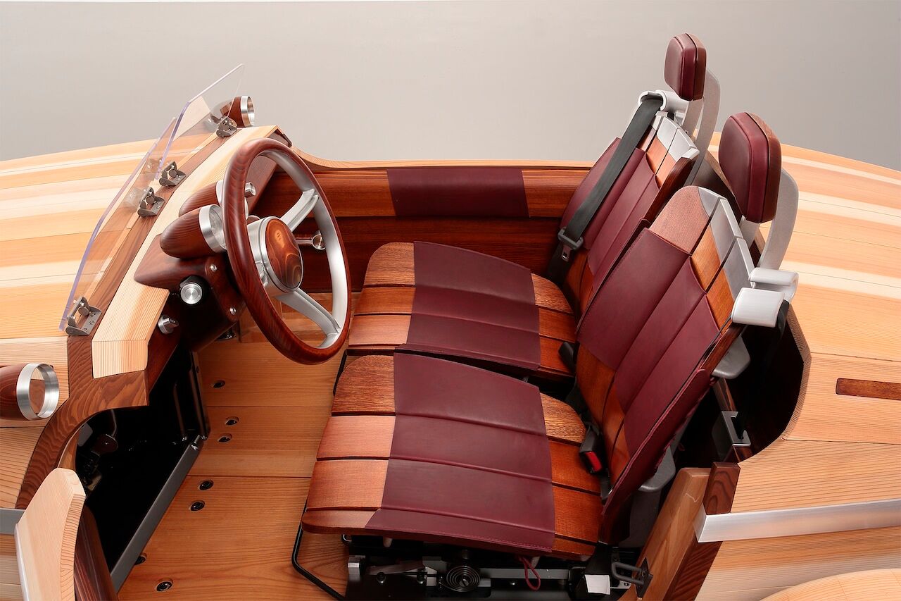Es un prototipo, de acuerdo, pero se quería que el Toyota Setsuna pudiese circular, girar y parar. Ello implicaba seleccionar diferentes maderas para cada función. Los paneles exteriores son de cedro japonés, por la viveza y el refinamiento de su grano y su flexibilidad como material. Para el bastidor se ha seleccionado abedul japonés por su rigidez gran rigidez, para el suelo se ha optado por zelkova japonés, habida cuenta de su resistencia y excelente durabilidad. Los asientos son de fatsia japónica, por su suave textura.