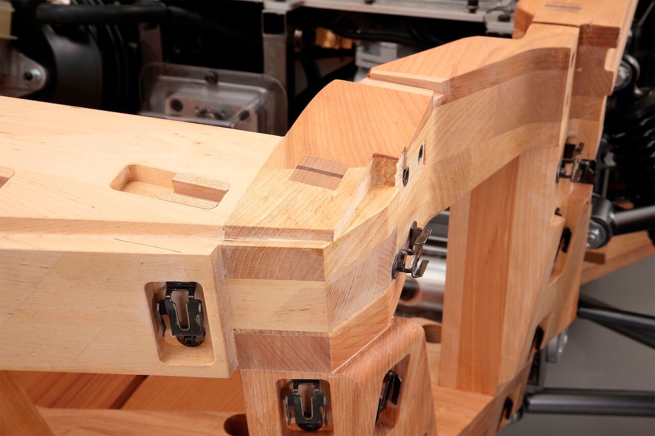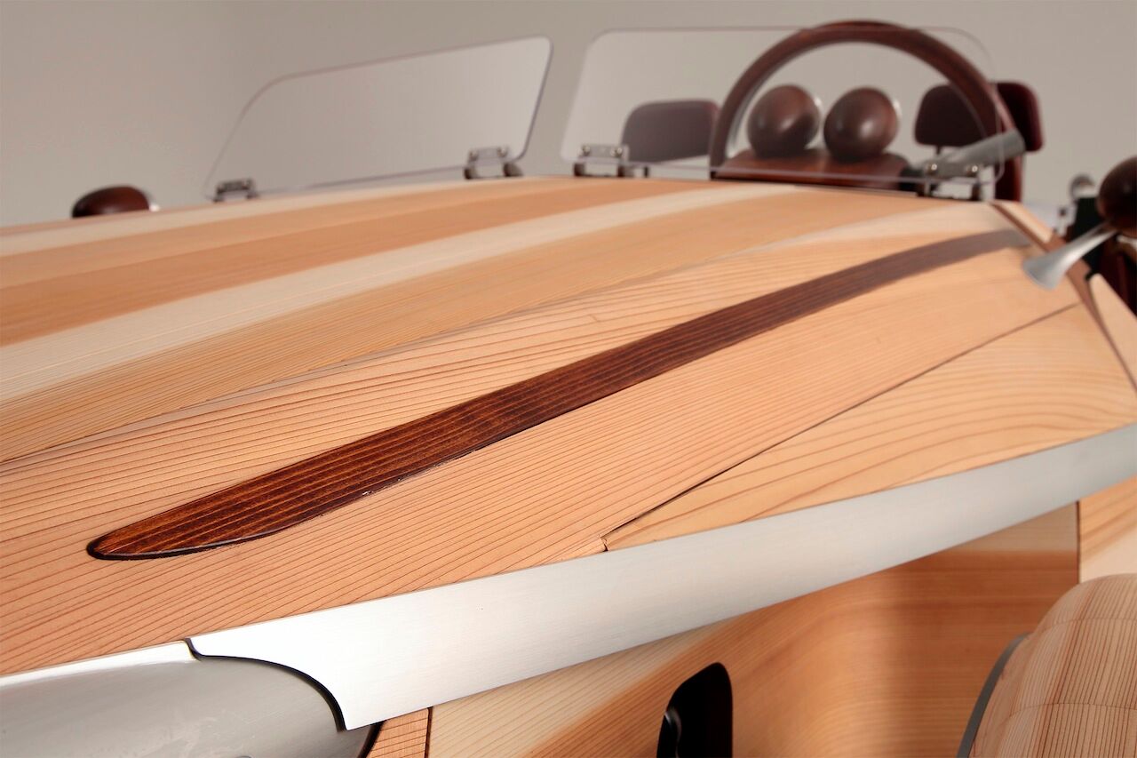 El barniz con que se han acabado las piezas del vehículo se ha aplicado a mano y, para resaltar el grano de la madera, en los retrovisores exteriores, asientos, volante y las franjas de color de la carrocería, aplicándolo repetidamente sobre la superficie y luego pasando un paño para que se deposite en las vetas de la madera.