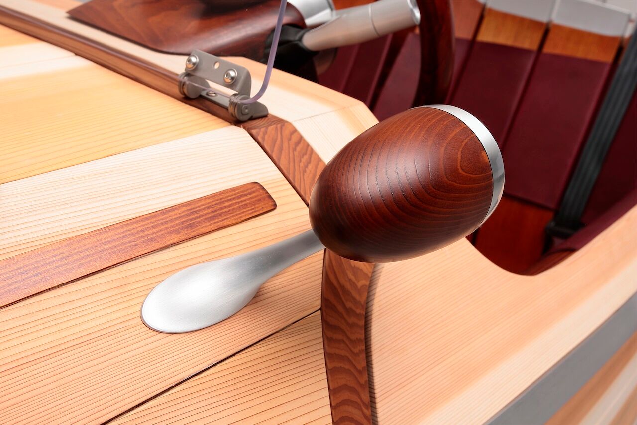 Se ha empleado aluminio en partes como los embellecedores de las ruedas, el volante y la estructura de los asientos, para crear un contraste con las piezas de madera.
