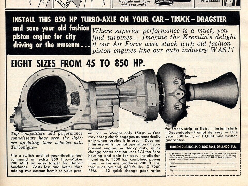 En 1962, un ingeniero llamado Clarence Eugene Middlebrooks Jr. fundó una empresa bautizada como Turbonique tomando como base su experiencia como contratista de defensa aeroespacial. Imagina el contexto por un segundo: este ingeniero pasó de ser diseñador de misiles balísticos (programa Pershing) a construir y vender “equipos de aumento de potencia” para automóviles. Y no cualquier cosa, sino cohetes adaptados para coches. Sí, tal cual, como lo lees. Era el óxido nitroso de los 60, pero la potencia adicional no se conseguía desde el motor, sino desde el eje.