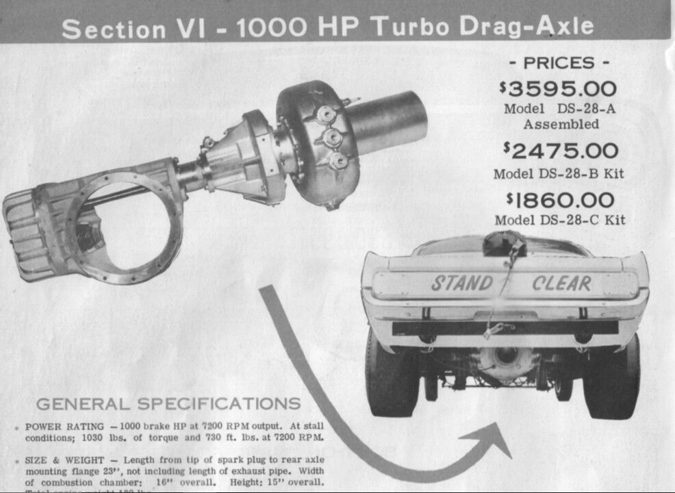 De las primeras ideas de “Gene” en ese momento nació el “eje para drag TB-28”, esencialmente un conjunto de micro turbina que se iba a montar directamente en el eje posterior del vehículo (en la época, casi todos los vehículos eran de propulsión). La idea prevista era complementar la potencia del motor durante las carreras de aceleración (drag races) y evitar pérdidas inherentes de las configuraciones tradicionales con turbocompresor. La línea de productos de la compañía constaba de tres elementos: compresores, ejes con cohetes y motores de empuje microturbo.