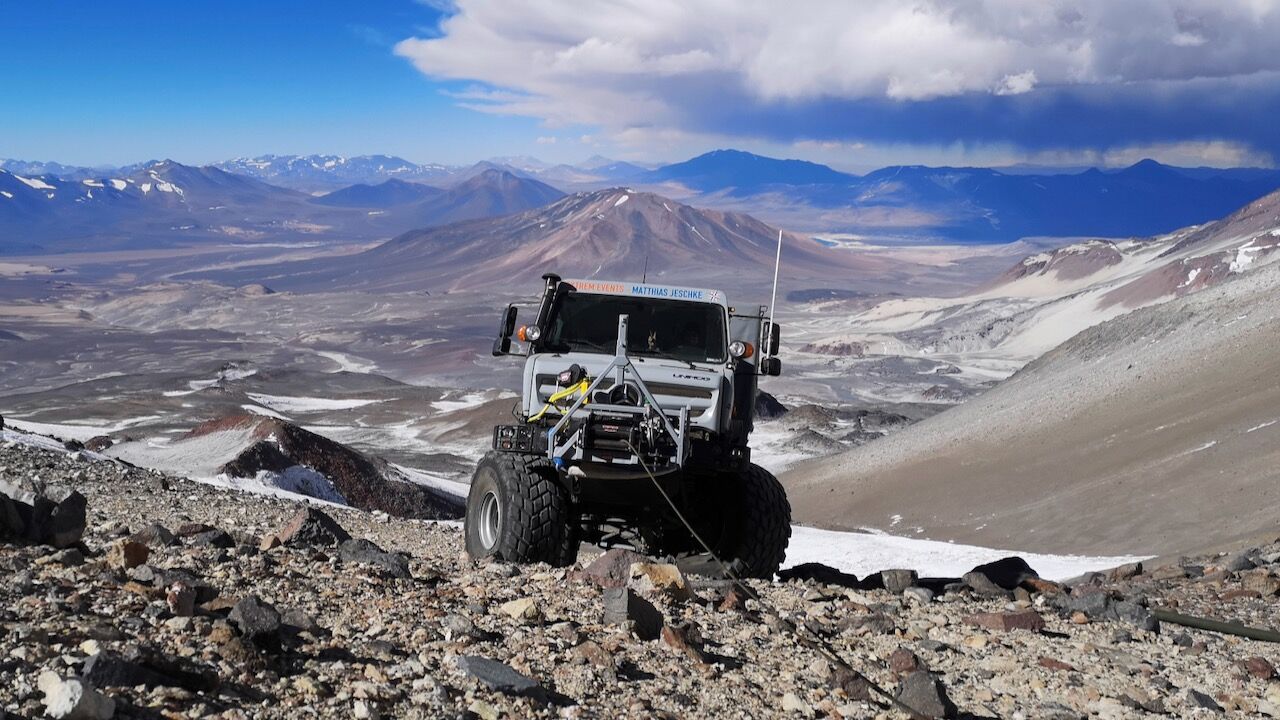 Esta aventura ha sido realizada por dos unidades del Unimog U 5023, que fue el vehículo elegido por Matthias Jeschke para llevar a cabo esta expedición que llevaría a diez personas. El objetivo era el de instalar cuatro radios de emergencia para conectar los campamentos de gran altitud que están en la ladera del volcán. Una vez llegaron al campamento Amistad, a 6.100 metros de altura, e instalaron el último dispositivo no pudieron quedarse ahí. Había que comprobar hasta donde podían llegar los Unimog.