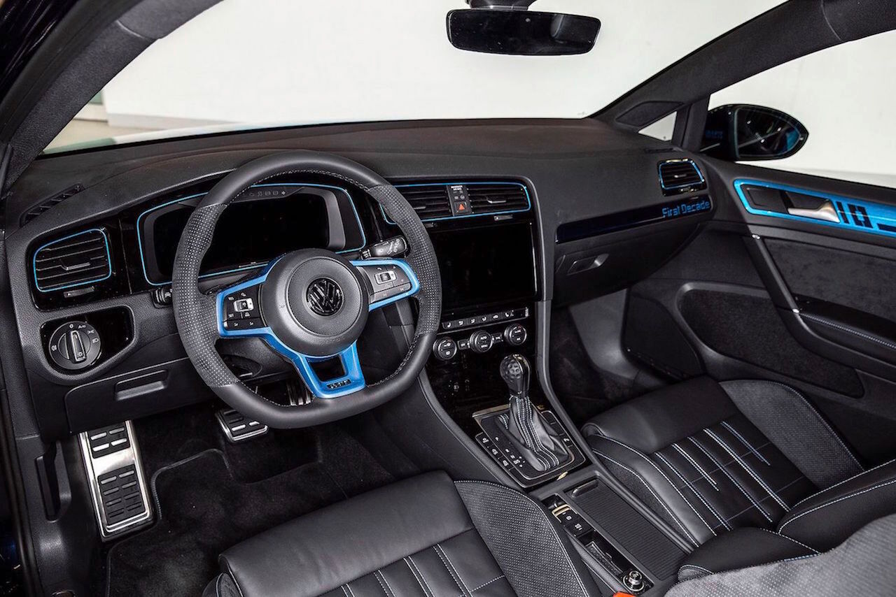 En cuanto a su diseño, el Volkswagen Golf GTI First Decade destaca por una atractiva combinación de colores que incluyen el azul oscuro y claro de la carrocería y las llantas azules y negras. Este compacto deportivo incorpora el mismo alerón trasero de la versión Clubsport y una serie de insignias con el nombre First Decade. En el interior, también encontramos una tapicería donde domina el color azul, además de un sistema de sonido de 1.690 vatios que incluye hasta 11 altavoces y un subwoofer.