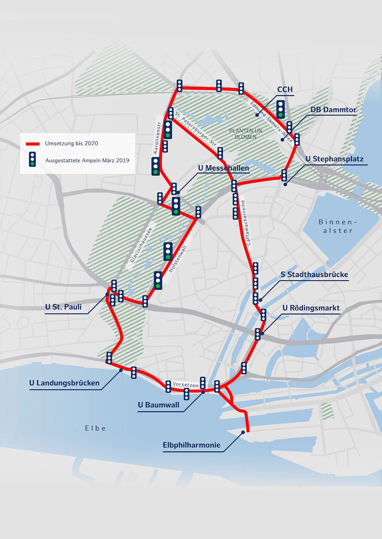 Por el momento se está probando en un recorrido de apenas tres kilómetros, la finalidad es recopilar todos los datos y seguir mejorando en este ámbito. Es interesante para fabricantes como Volkswagen conocer sus propias posibilidades técnicas, así como los requisitos de la infraestructura urbana. Están trabajando para que el circuito se amplíe hasta los 9 kilómetros para 2020, con Hamburgo dando facilidades y mejorando los semáforos con flujos de información I2V (infraestructura-vehículo) y V2I (vehículo-infraestructura).