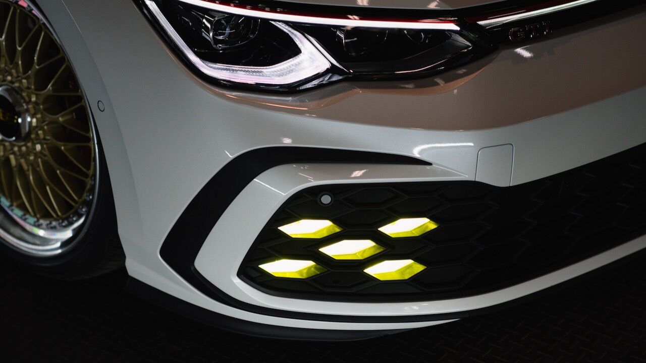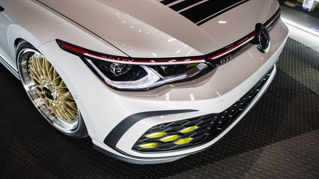 Ya por fuera se pueden ver algunas modificaciones interesantes, a pesar de que la carrocería se ha mantenido intacta. Probablemente lo más llamativo sean las llantas BBS Super RS de 19 pulgadas que dan nombre a la edición especial. Tienen ese acabado dorado y ese característico diseño que fue tan popular en la década de los 80 y que acompañó a muchos Golf GTI de la época. También aparecen las luces antiniebla en color amarillo o unos gráficos en rojo y negro a lo largo del capó y del lateral del coche.