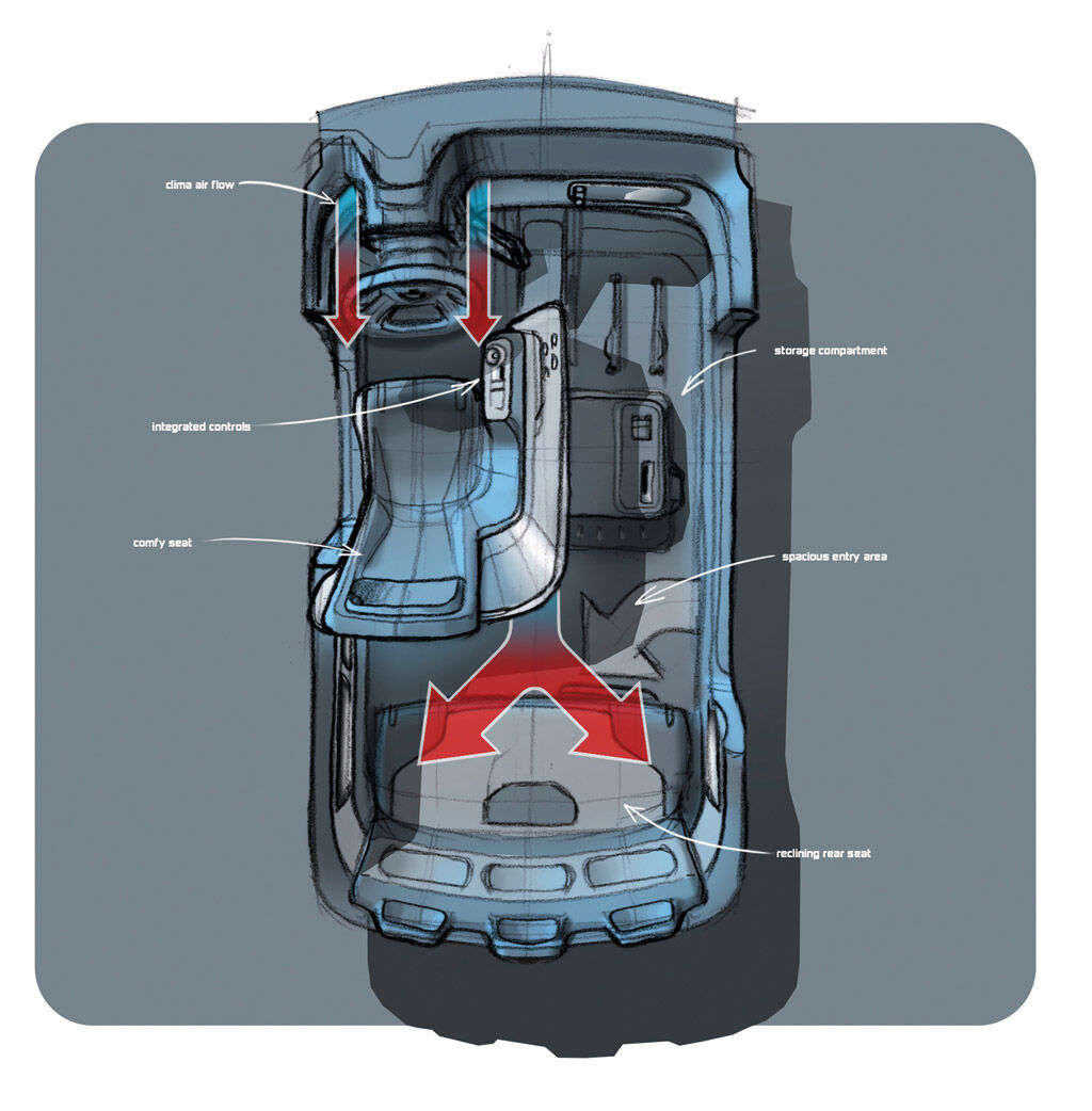 Una vez dentro, en la parte delantera hay una única plaza destinada al conductor, mientras que el asiento del copiloto se destina para depositar objetos o maletas, pues no cuenta con maletero.