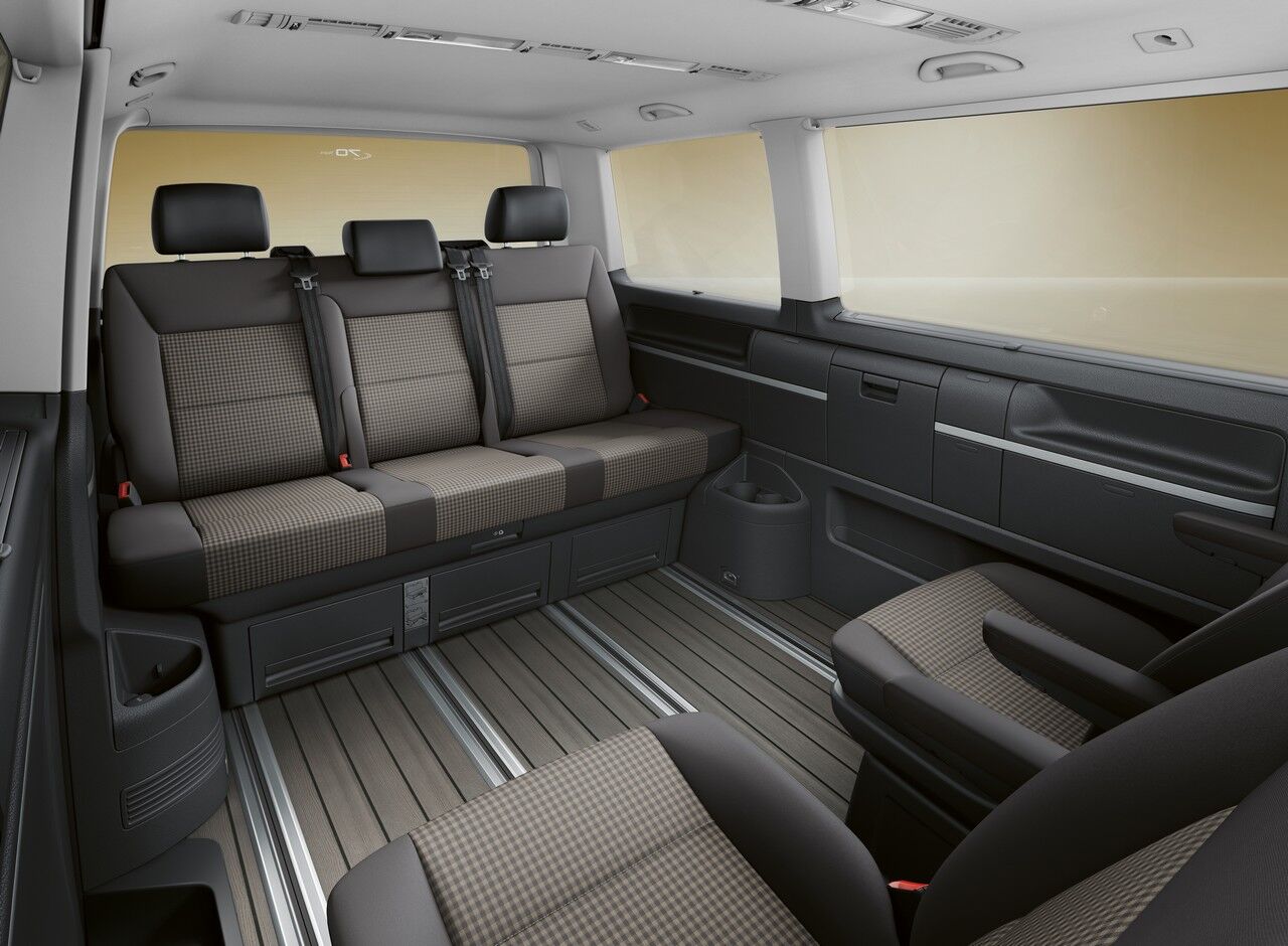 En el interior, el Bulli 70 aniversario ofrece una imagen bastante sofisticado y moderna para lo que estamos acostumbrados a ver en un vehículo comercial. La Multivan está equipada de serie con un volante multifunción de cuero, una pantalla multifunción «Premium» y un panel de instrumentos enmarcado por un embellecedor Negro Glossy, que normalmente solo está disponible para la variante Highline. El suelo con raíles viene con look de madera estilo barco.