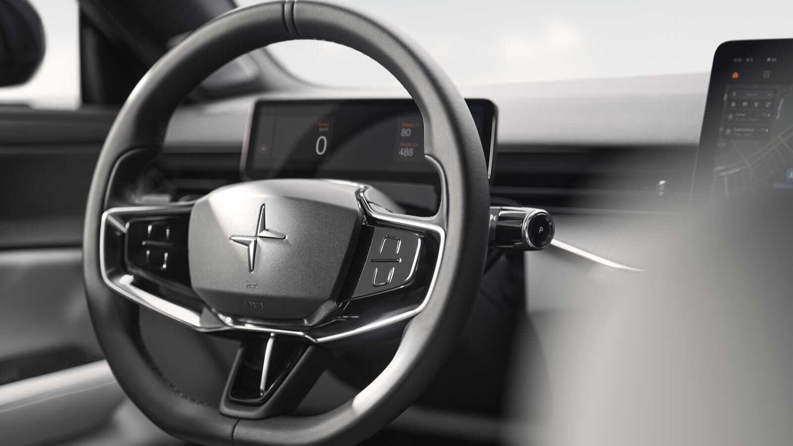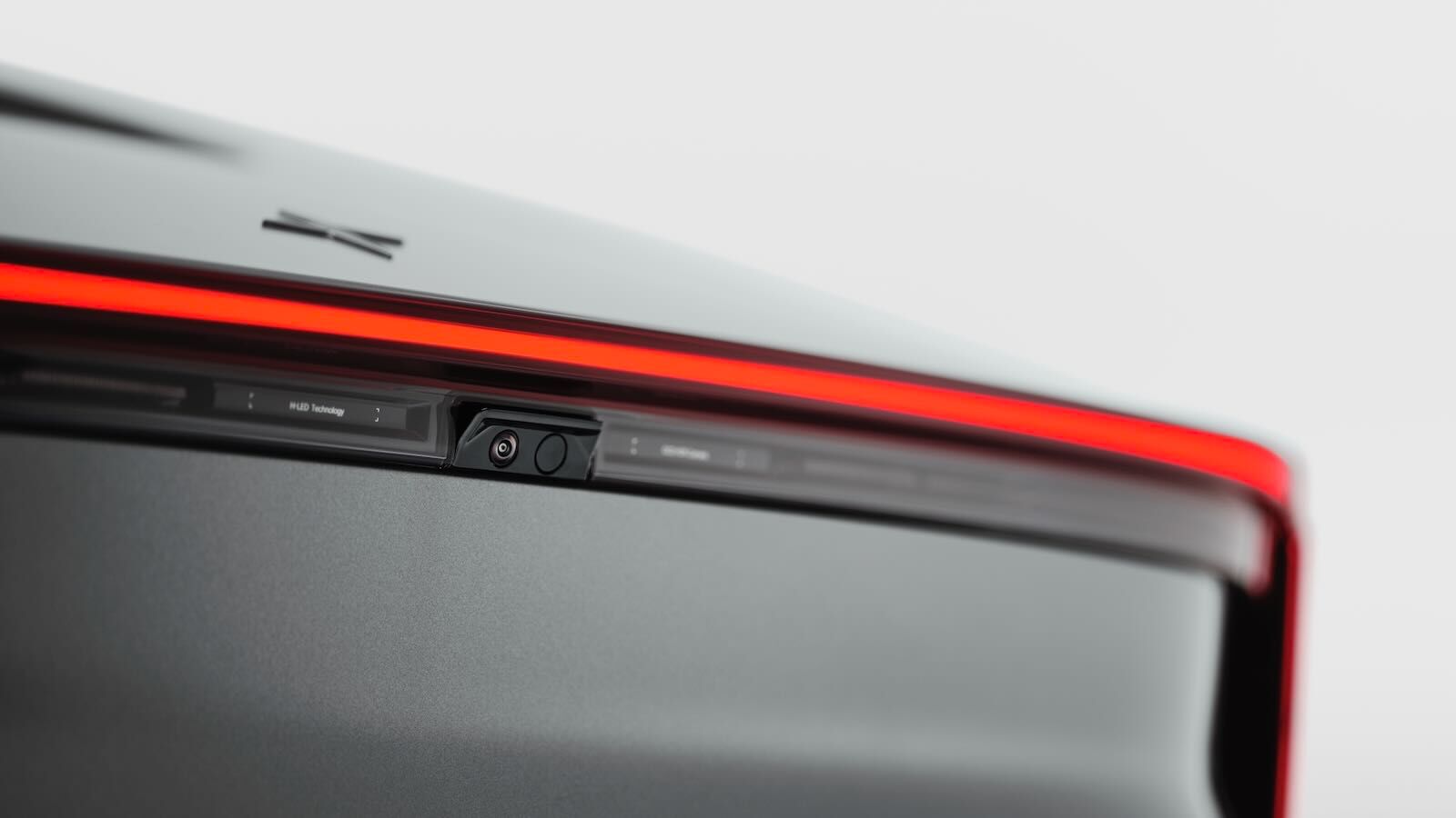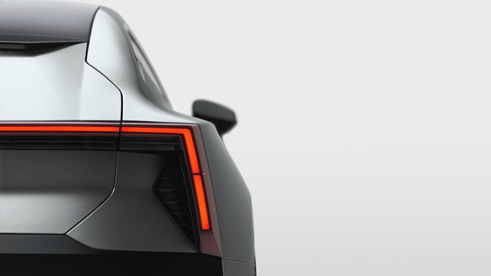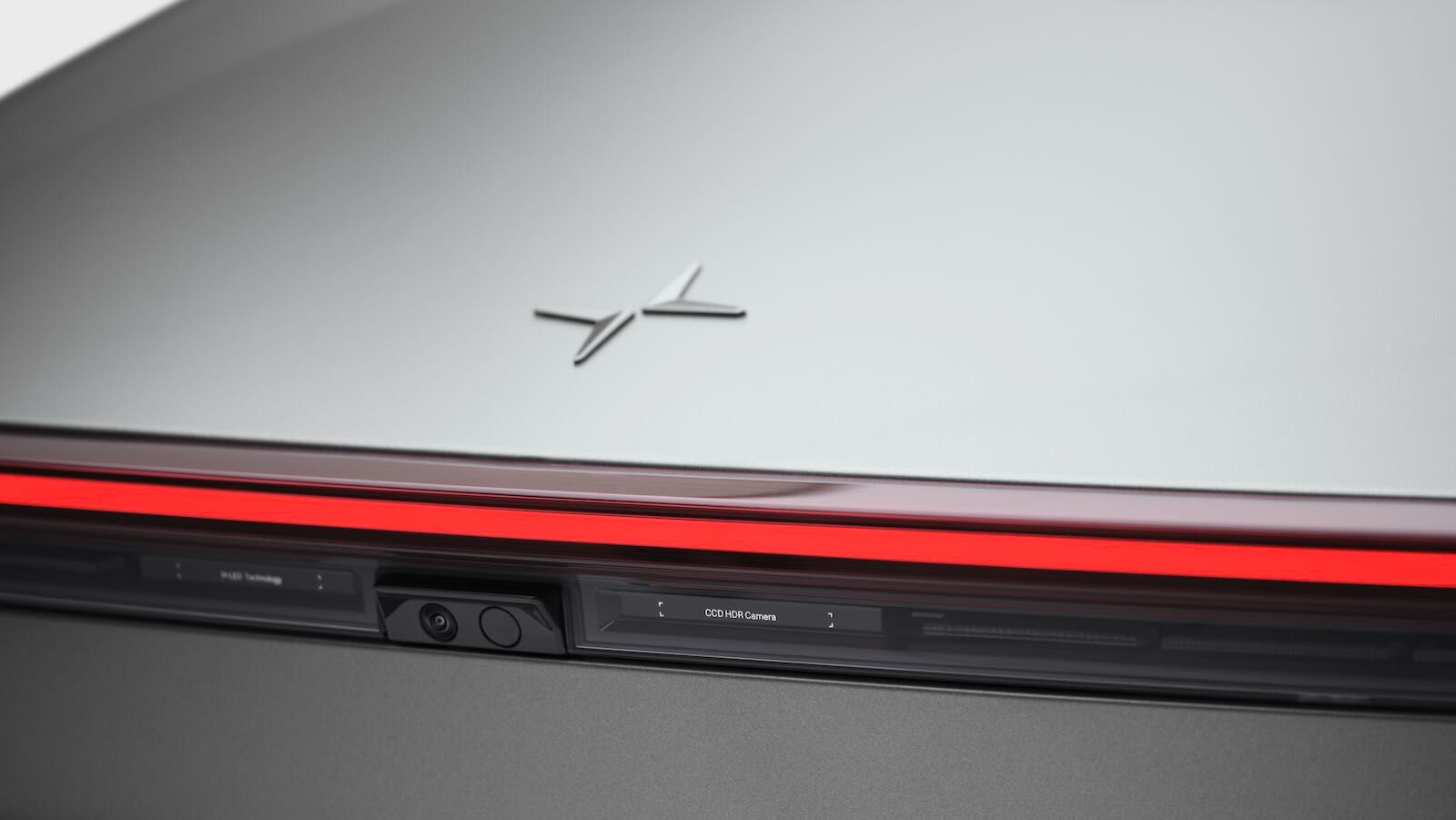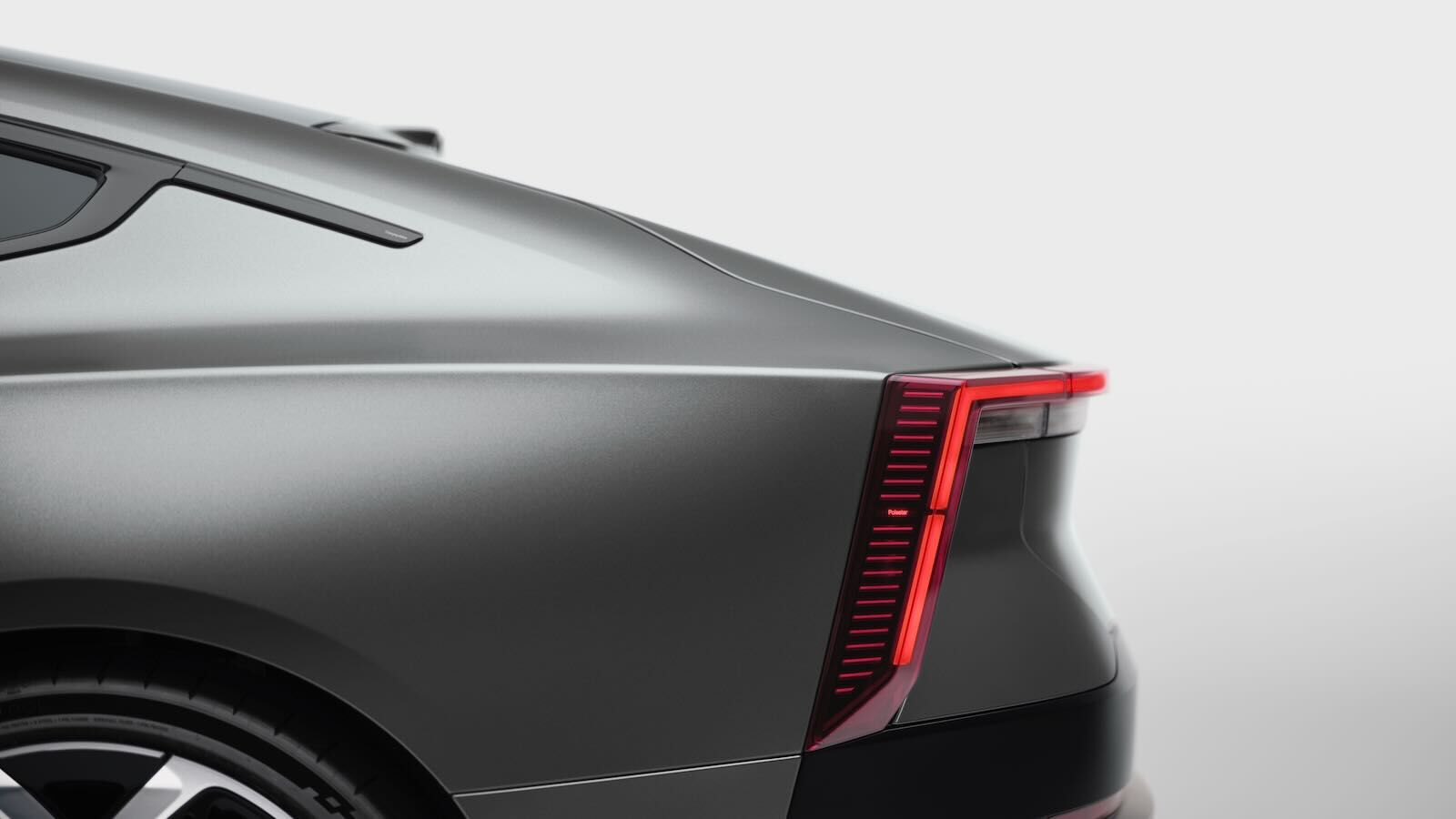 La parte delantera está dominada por la SmartZone, un elemento que reemplaza la calandra tradicional y alberga sensores y radares. Está flanqueado por los característicos faros duales de Polestar con tecnología Pixel LED. La cercanía entre rueda y línea del capó es única en el segmento.