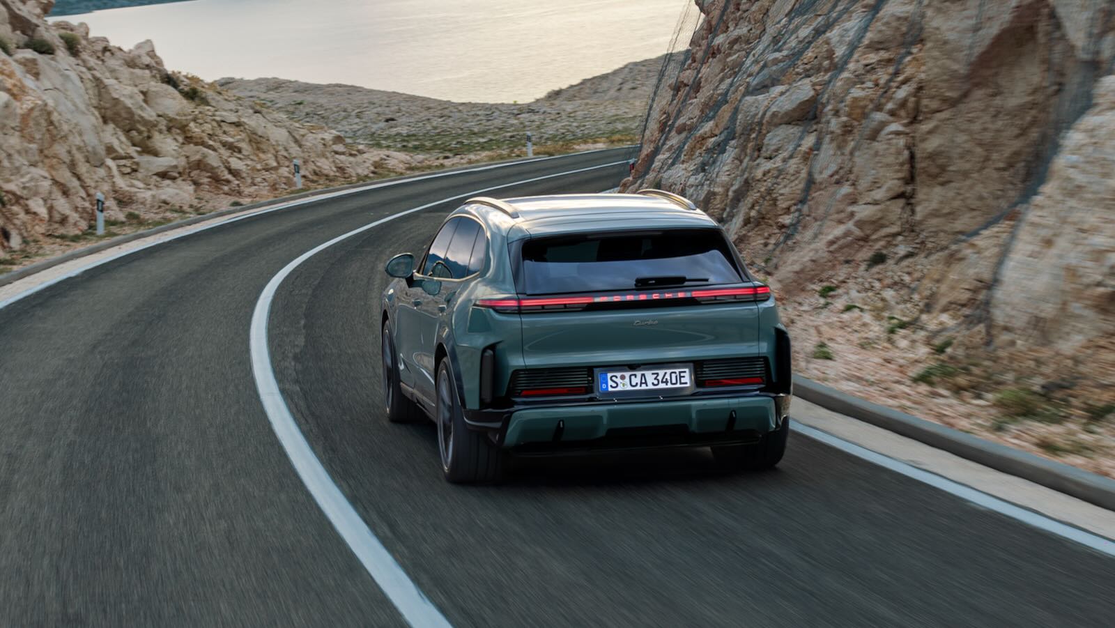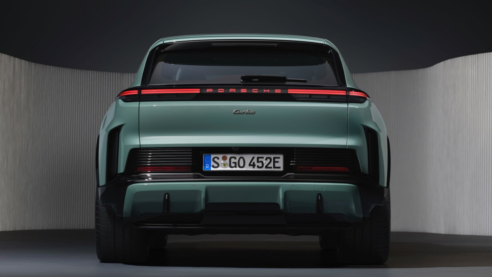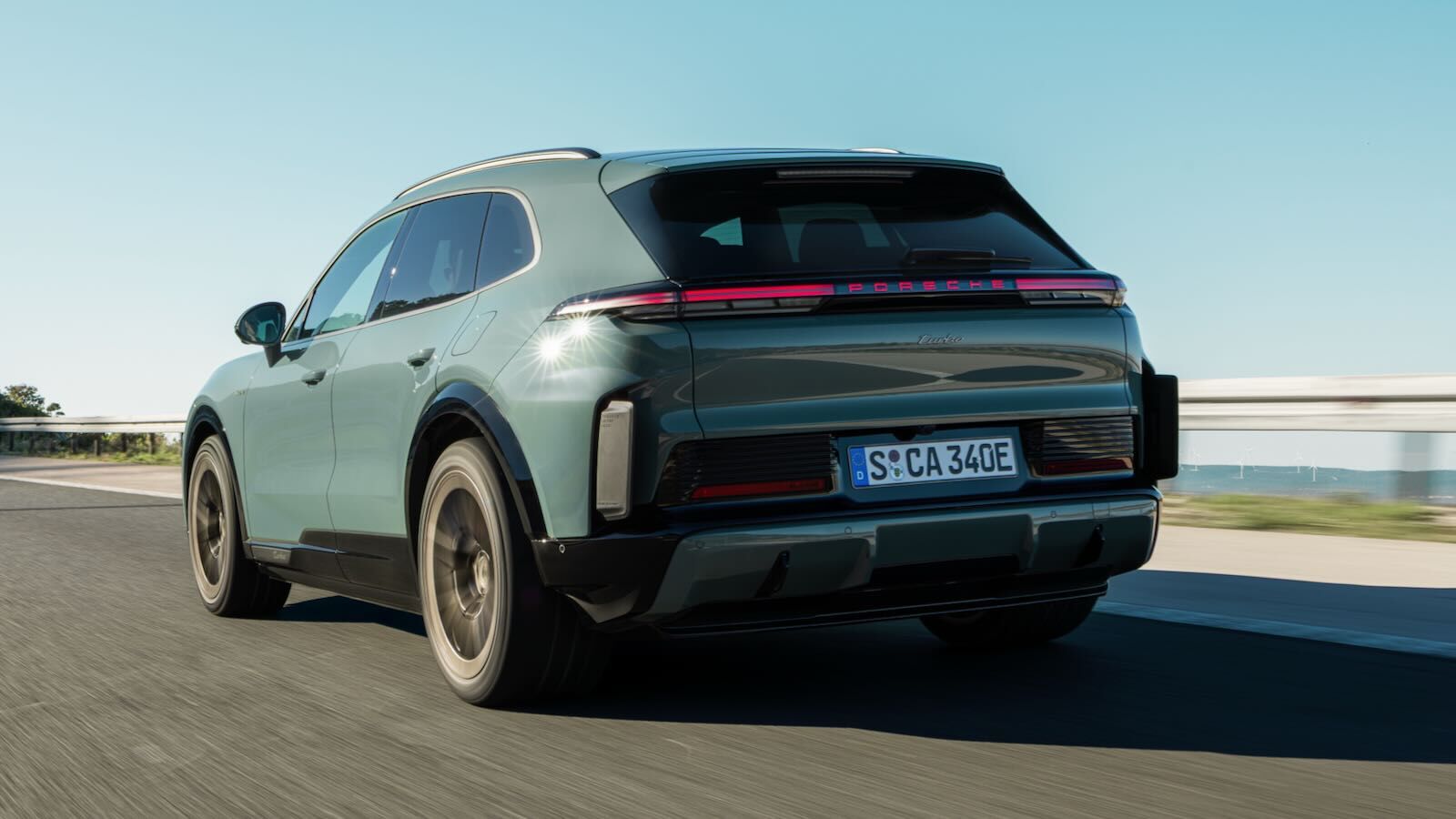 En la zaga incorpora una barra LED 3D y la inscripción «Porsche· iluminada, mientras los elementos aerodinámicos activos (spoiler, aeroblades, cortinas de aire) y la gestión de flujos en bajos y llantas ayudan a conseguir un Cx de solo 0,25, excepcional para un SUV de este tamaño (el Cayenne de combustión anuncia 0,35).