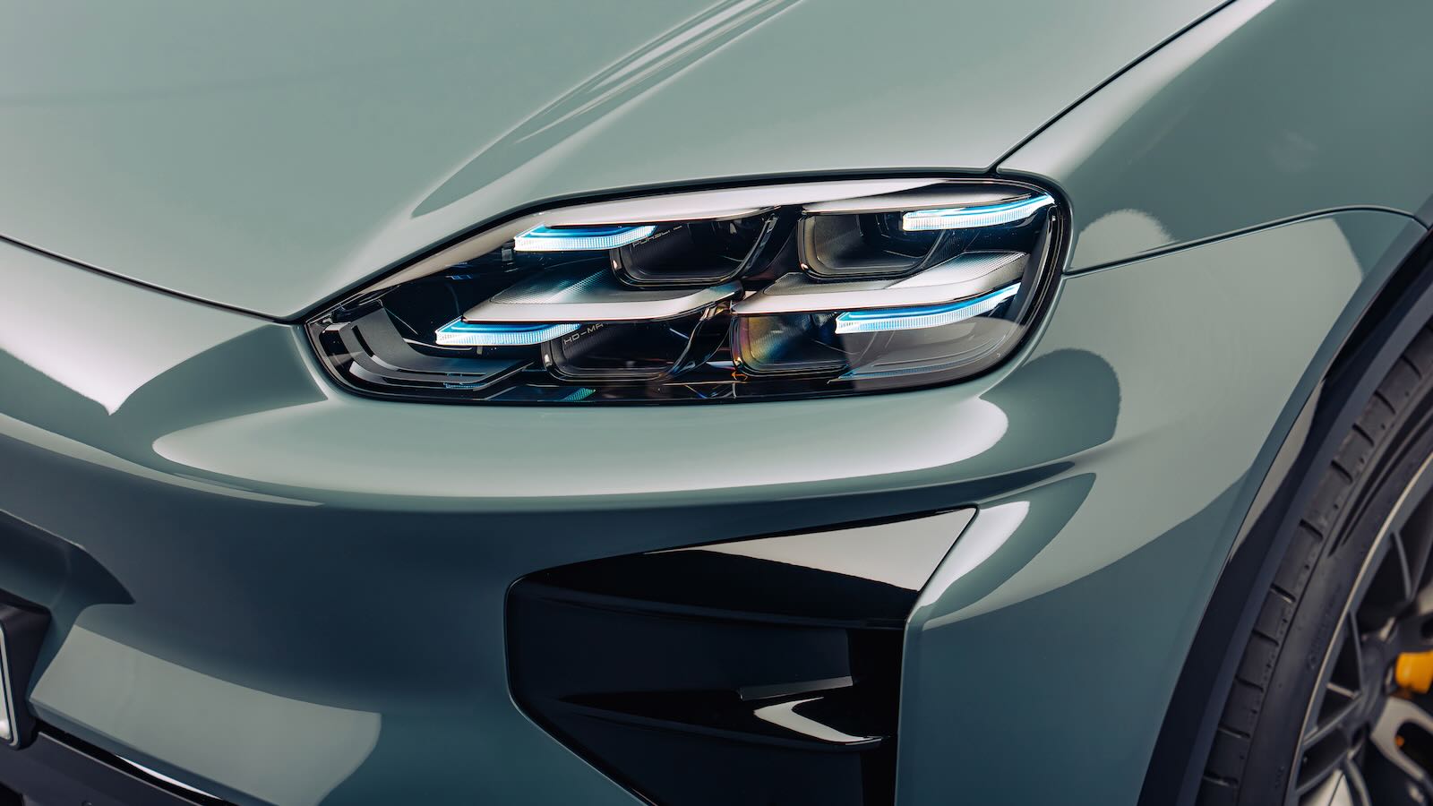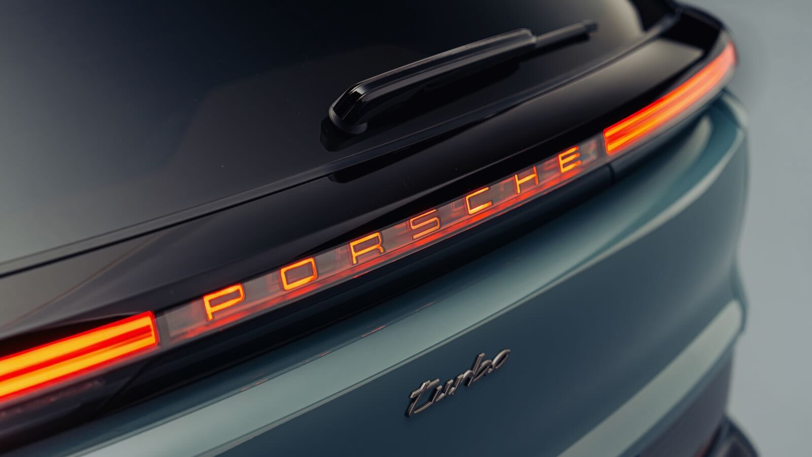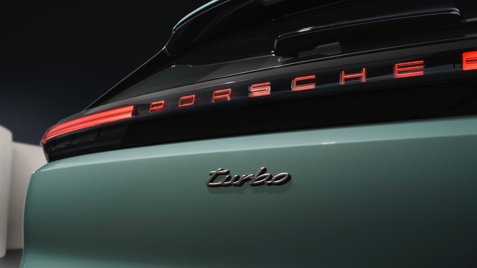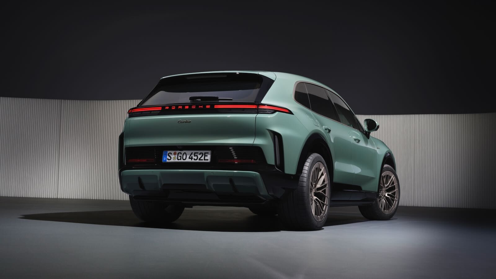 En la zaga incorpora una barra LED 3D y la inscripción «Porsche· iluminada, mientras los elementos aerodinámicos activos (spoiler, aeroblades, cortinas de aire) y la gestión de flujos en bajos y llantas ayudan a conseguir un Cx de solo 0,25, excepcional para un SUV de este tamaño (el Cayenne de combustión anuncia 0,35).