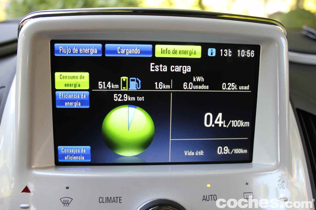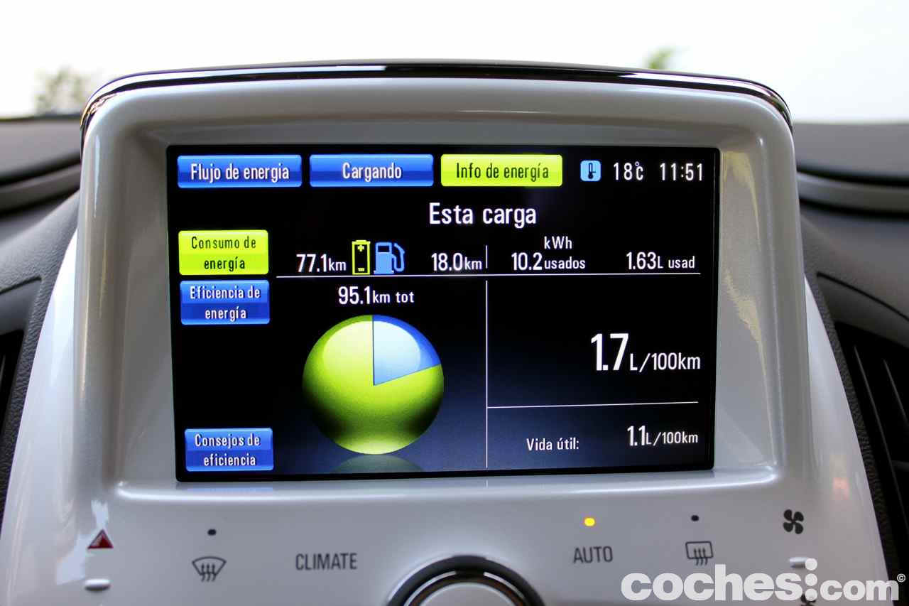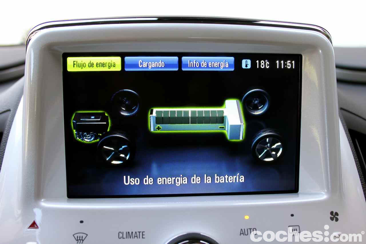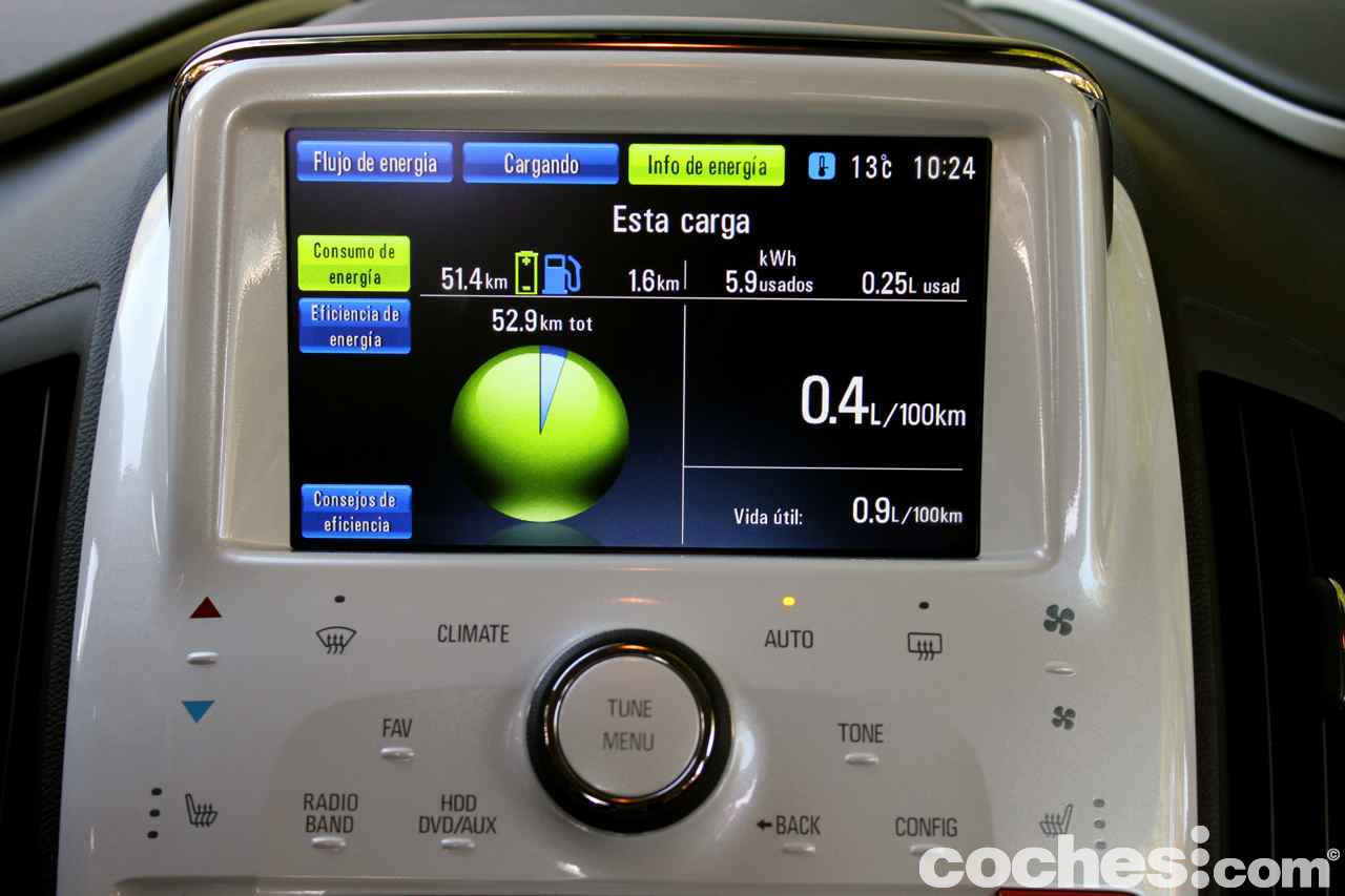 ¿Y consumos? Debido al peso extra de las baterías (el Volt marca en la báscula 1.732 kilos), cuando el motor de gasolina de 1.4 litros genera la electricidad, consume bastante. El depósito es de 35 litros y la marca habla de una autonomía de 450 kilómetros (solo con gasolina), así que consumiría en torno a 7,7 litros cada 100 kilómetros. Eso sí, no en todo momento, solamente cuando usamos el motor. Los primeros 70 kilómetros los haremos sin consumir combustible. La batería de ion litio de 16 kWh, que pesa 198 kilos, y se recarga en menos de cuatro horas en cualquier enchufe. Su esperanza de vida es de diez años o 240.000 km, y está garantizada por 8 años o 160.000 km.