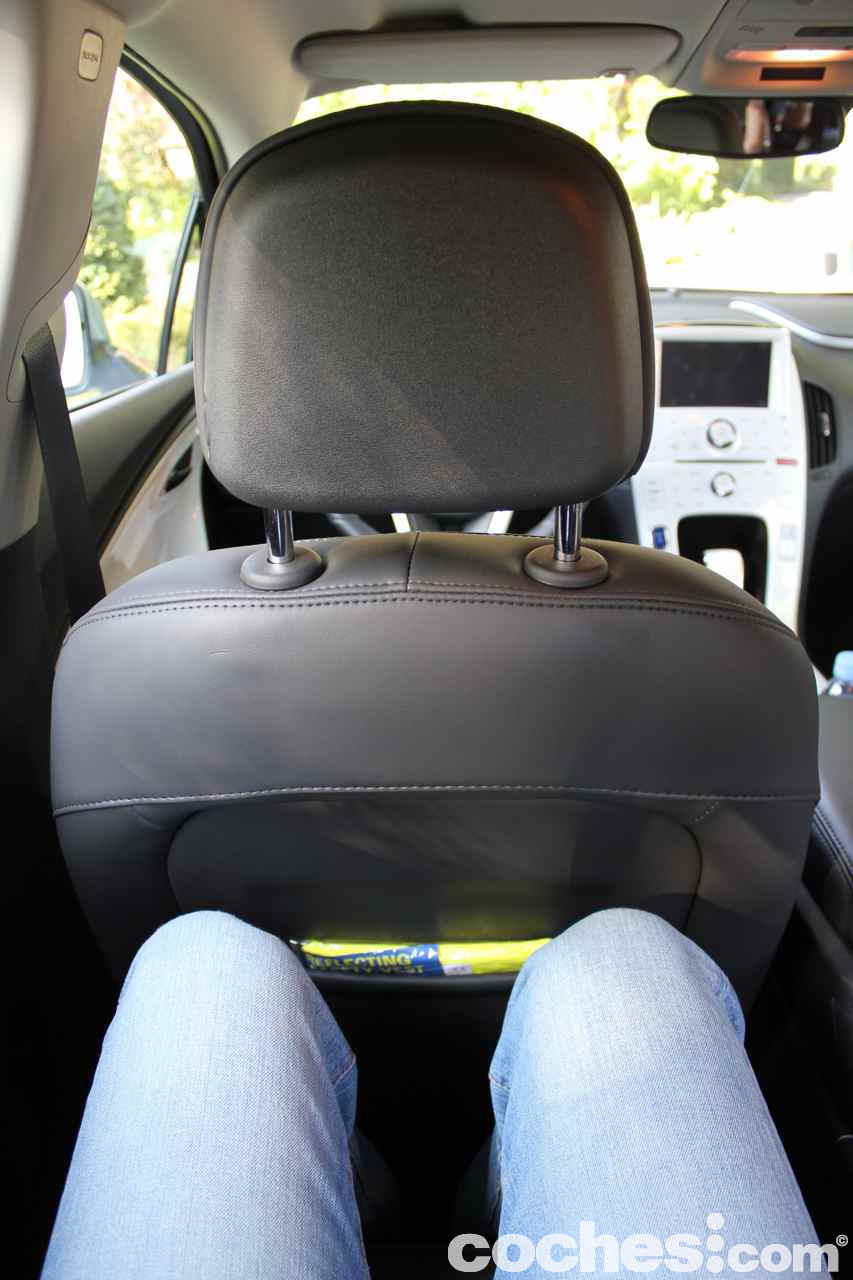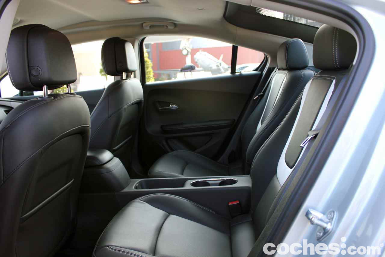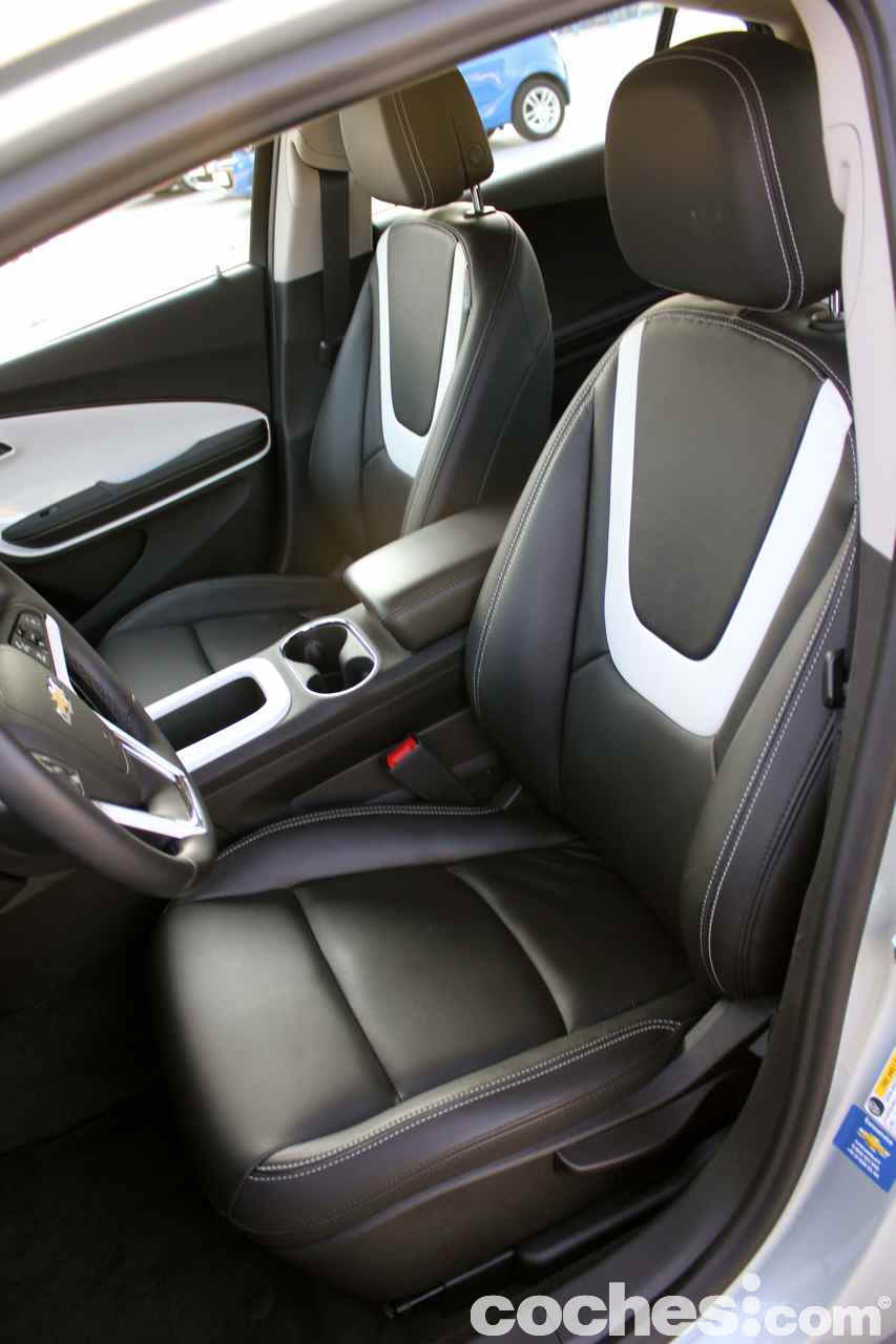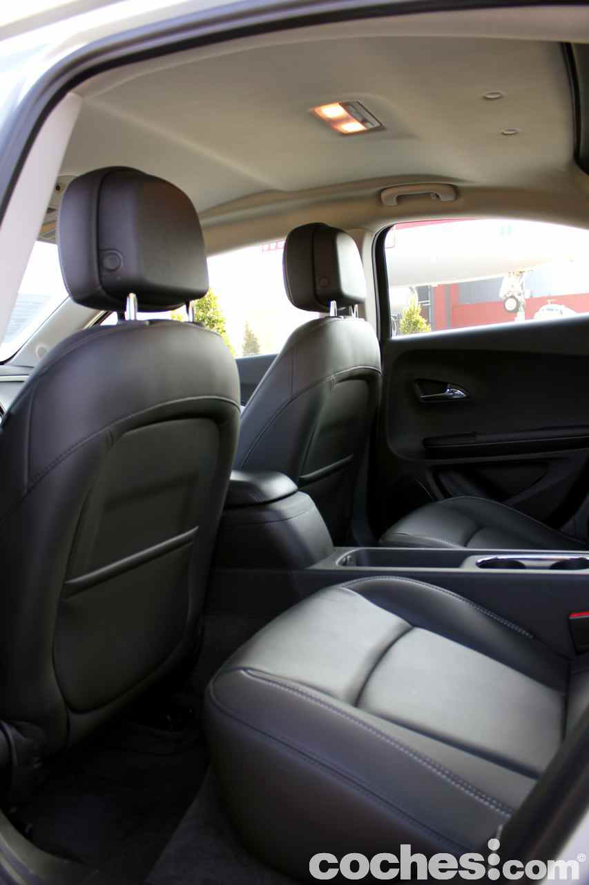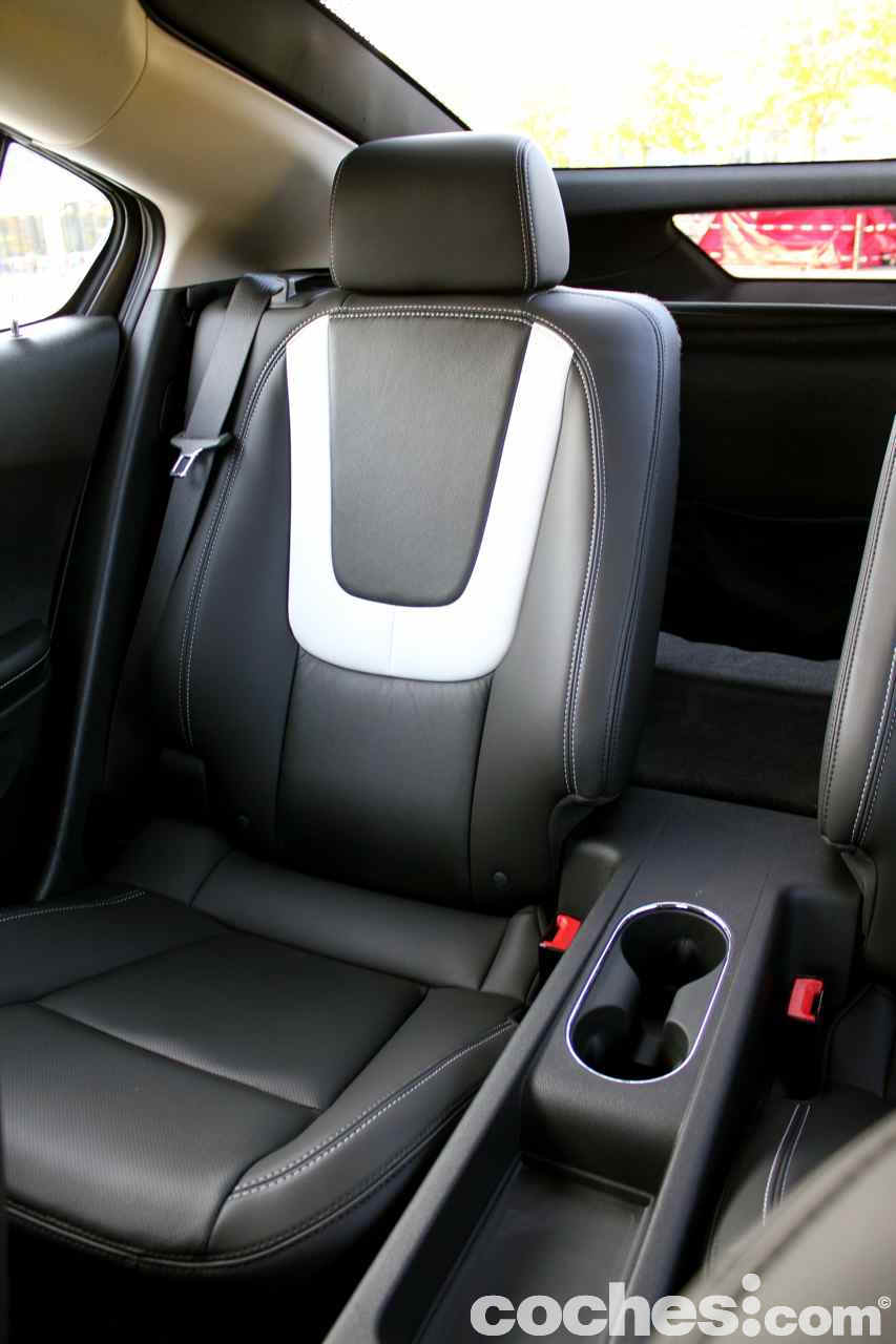 El principal inconveniente del Volt es su escasa habitabilidad. Delante hay dos asientos de cuero cómodos y el espacio es similar al de cualquier otro coche de tamaño similar al Volt. Los asientos son cómodos y sujetan en cuerpo bien. Las plazas traseras tienen dos asientos individuales, exactamente iguales a los delanteros, muy cómodos también. Son asientos de cuero de serie. ¿El problema detrás? Además de no tener tercer asiento ni como opción, al ser tan bajo en la parte trasera es fácil tocar con el techo de cristal (que está oscurecido para que el sol no abrase a los pasajeros), si se pasa algún badén o se circula rápido. El espacio para las piernas (yo mido 1,80 metros) sí me pareció muy correcto para un compacto. El Chevrolet llegará a España con un único equipamiento disponible. Nuestra unidad iba además equipada con los mejores extras: