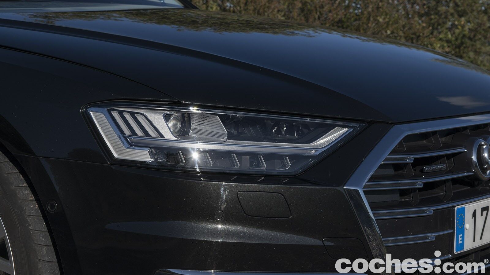 El exterior del Audi A8 viene inspirado por el prototipo Audi Prologue Concept. Esto se traduce en un frontal que gana en presencia, más contundente gracias a la parrilla Singleframe. Es hexagonal, más grande y situada en una posición más baja. Queda flanqueada por unos faros estrechos, que en opción pueden ser HD Matrix LED con tecnología láser. En el paragolpes recibe algunas molduras cromadas, que van a juego con la parrilla.