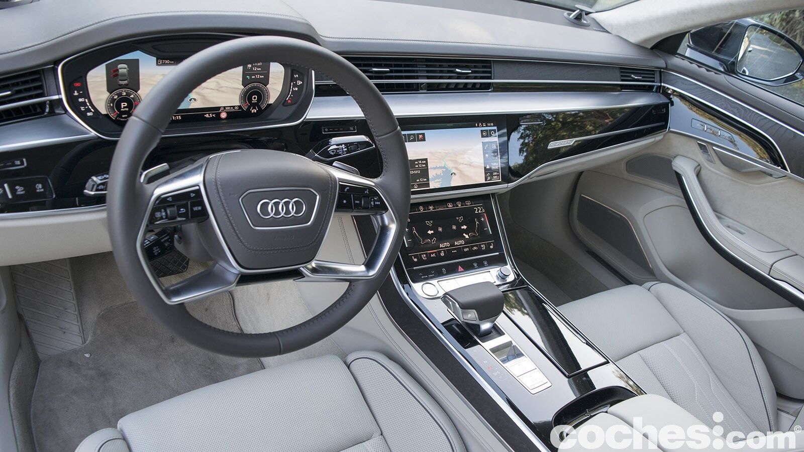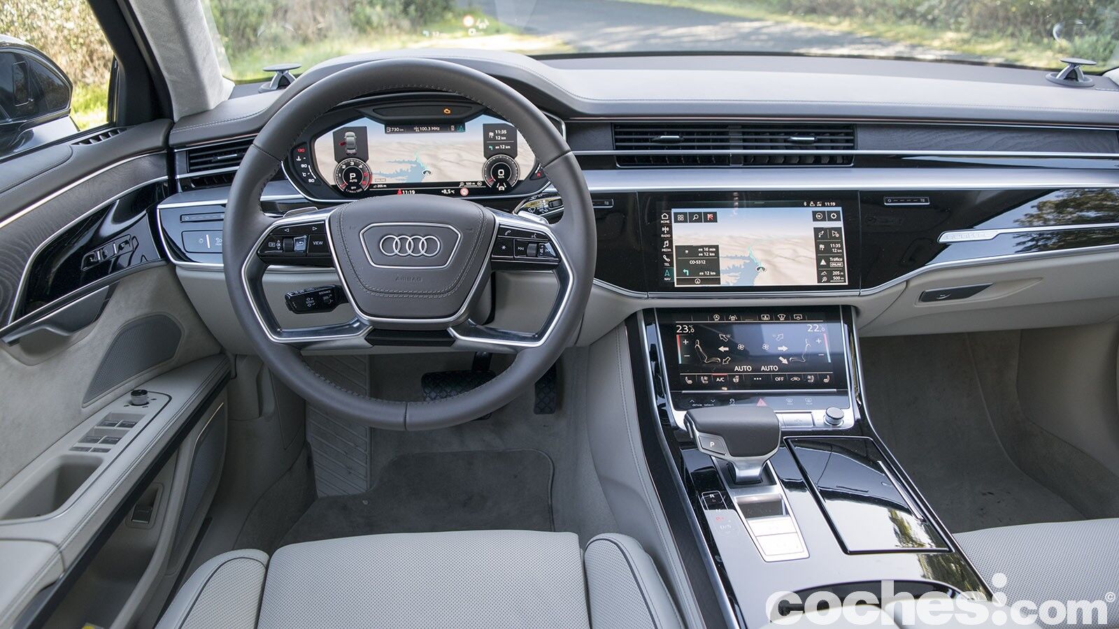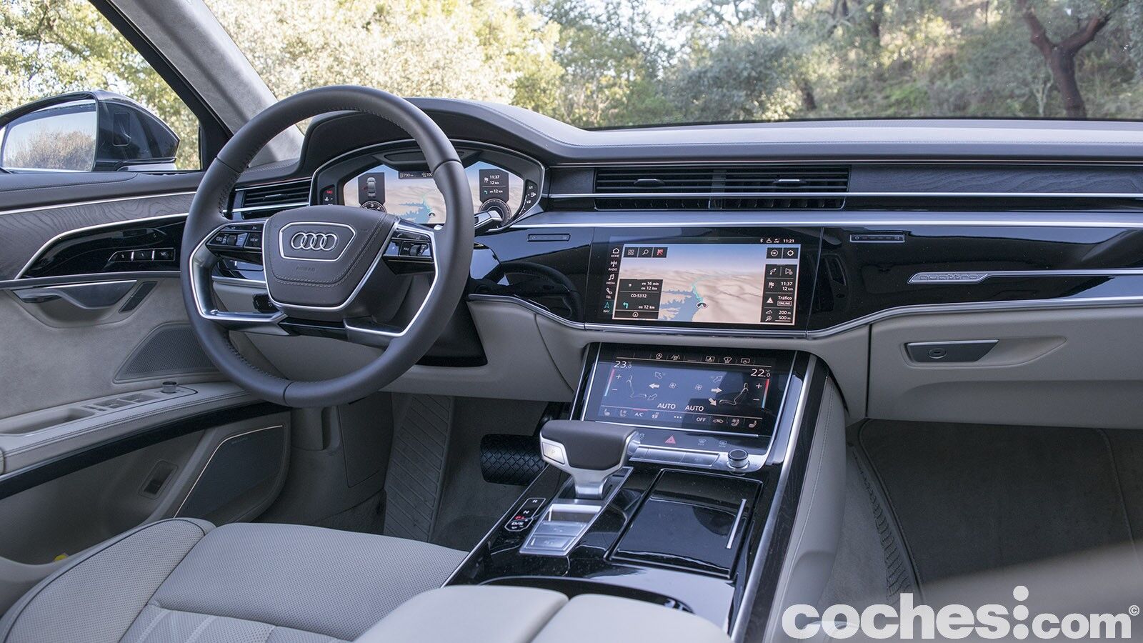 Entrar al interior del Audi A8 por primera vez es algo que puede aturullar ligeramente. Ya anunciaban que este modelo llevaría la tecnología por bandera y eso se comprueba nada más sentarse en el asiento del conductor. Ahí te rodean tres pantallas a color, así que vayamos por partes. La primera es el habitual Virtual Cockpit, la instrumentación digital de 12,3 pulgadas totalmente personalizable y mejorado para este modelo.