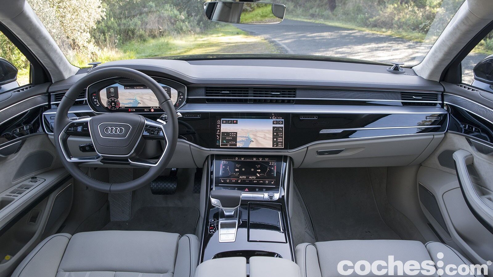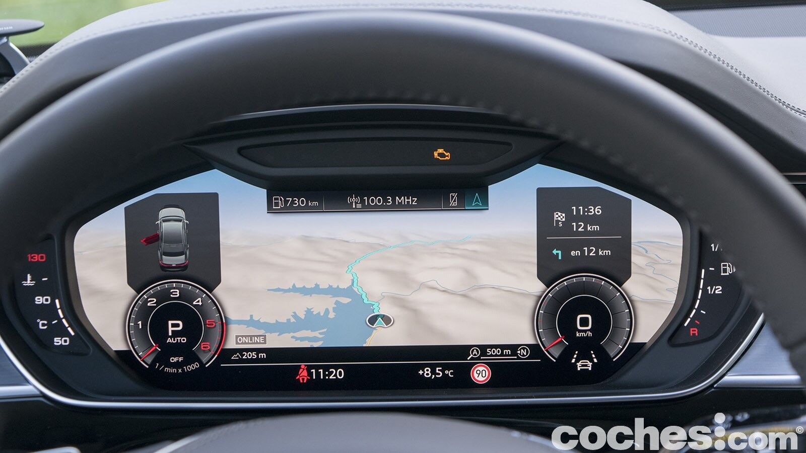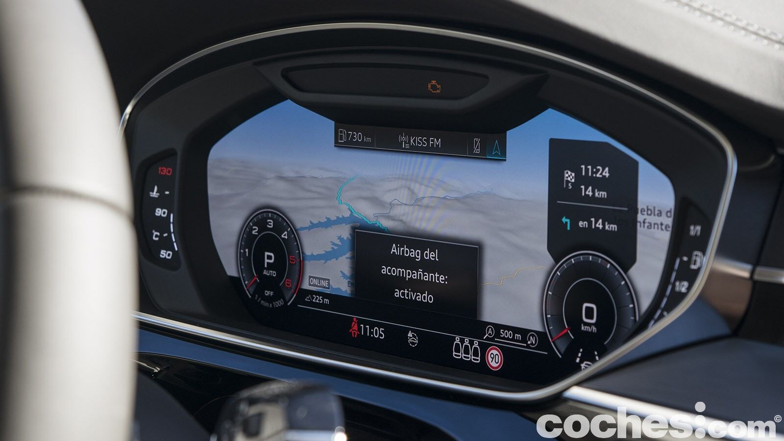 Entrar al interior del Audi A8 por primera vez es algo que puede aturullar ligeramente. Ya anunciaban que este modelo llevaría la tecnología por bandera y eso se comprueba nada más sentarse en el asiento del conductor. Ahí te rodean tres pantallas a color, así que vayamos por partes. La primera es el habitual Virtual Cockpit, la instrumentación digital de 12,3 pulgadas totalmente personalizable y mejorado para este modelo.