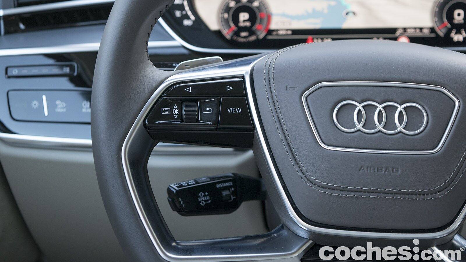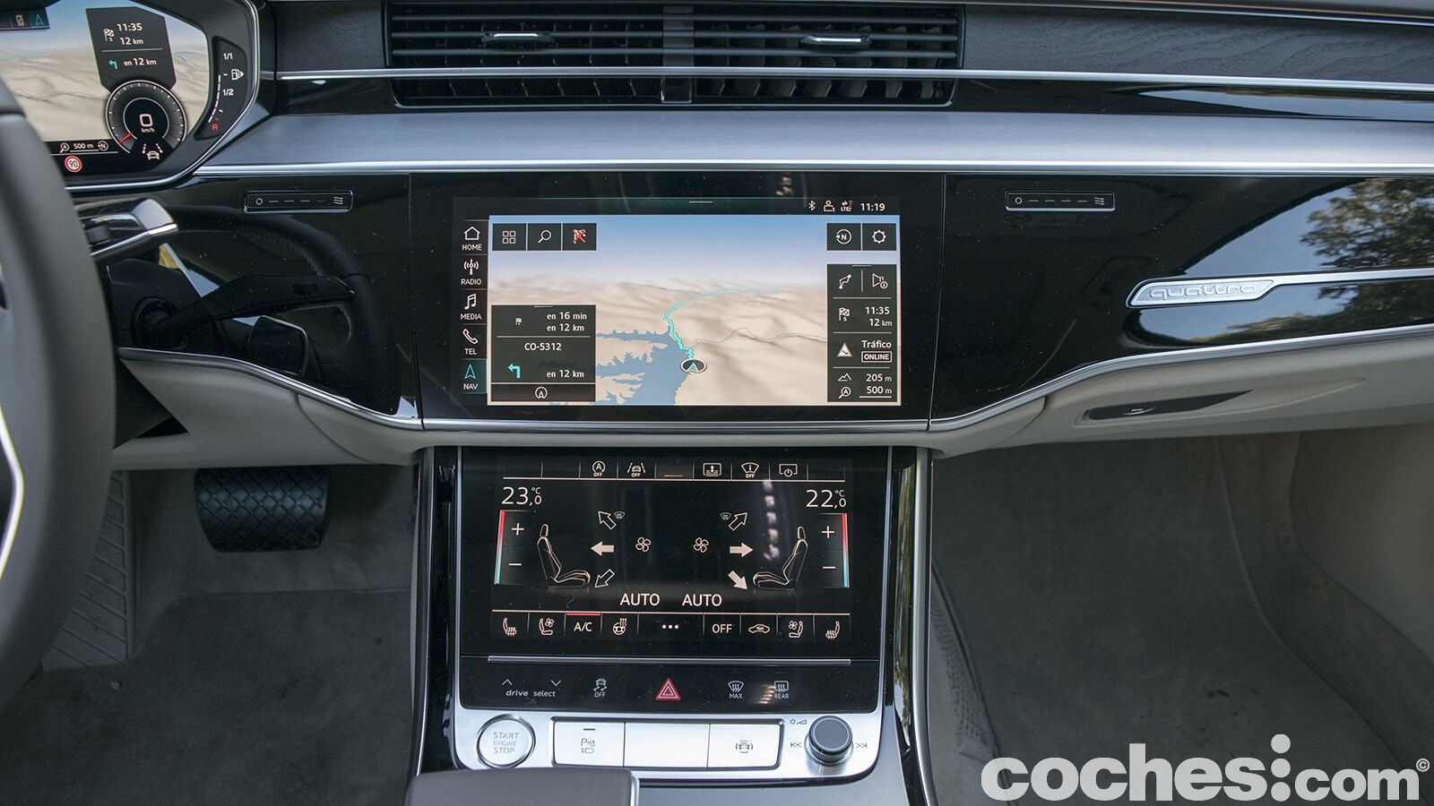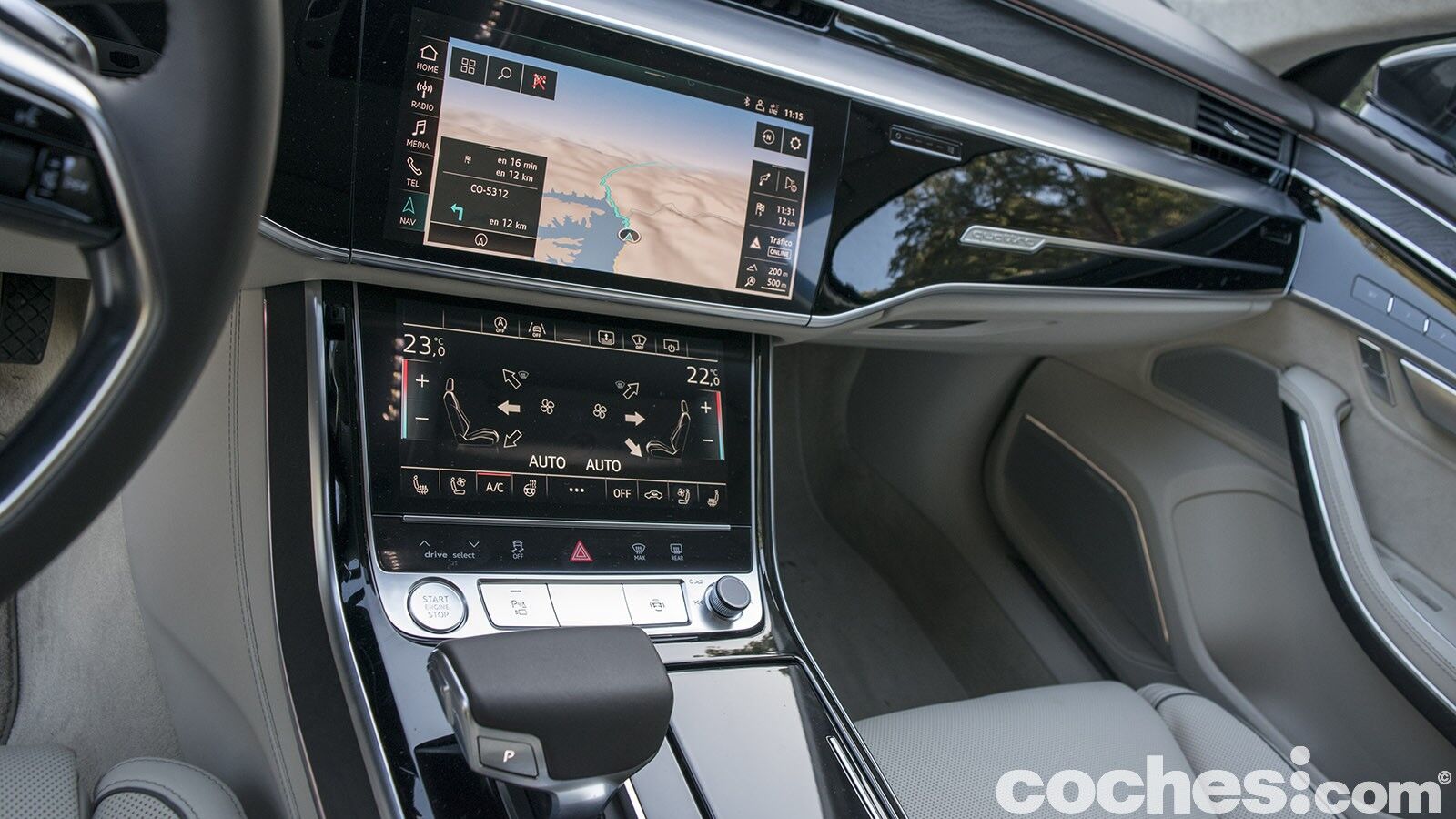 Con este MMI touch response, queda patente que el número de botones en el nuevo Audi A8 es muy reducido y eso tiene ventajas y desventajas. Su uso es intuitivo, pero aún así requiere de cierto aprendizaje y de quitar la vista de la circulación (principalmente con la climatización). Llama la atención que todos estos sistemas no van enfocados directamente al conductor (como en los deportivos), sino que apuntan también hacia los acompañantes.