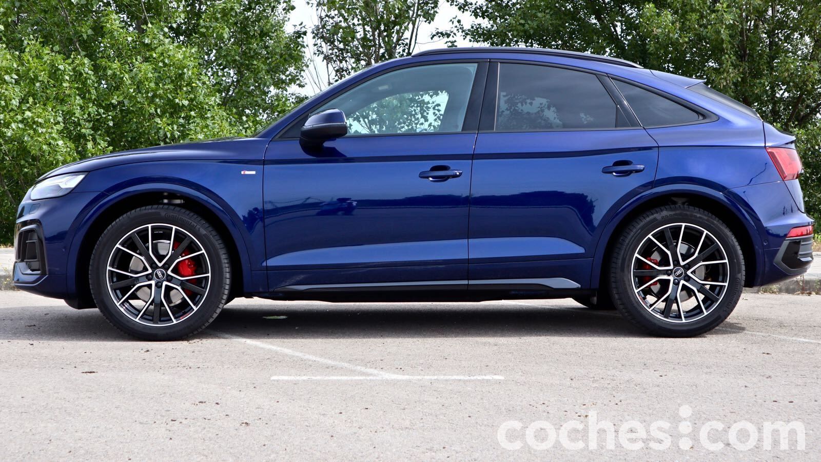En el lateral copia al Q5 convencional hasta la mitad del coche y luego hay una caída del techo propia de estos vehículos. Hay una línea de tensión por encima de las ventanillas que va subiendo, como queriendo unirse a la que cae desde el techo.