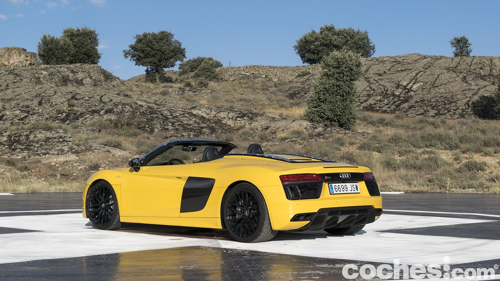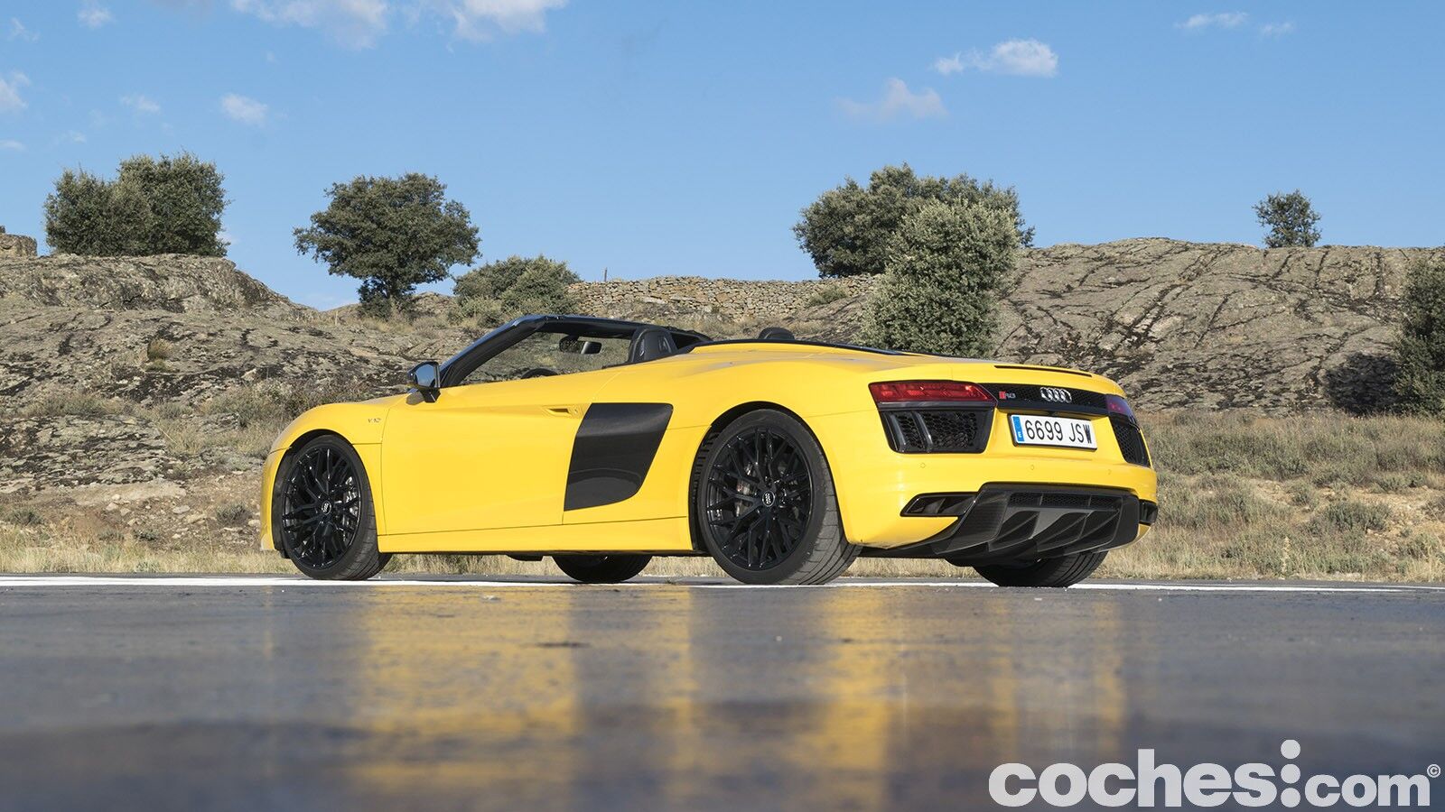 Pero bueno, queda claro que está ahí el predominante diez cilindros atmosférico con lubricación por cárter seco y doble árboles de levas en cabeza (DOHC). En este modelo desarrolla 540 CV y 540 Nm de par a 6.500 rpm y va ligado al cambio automático S tronic de doble embrague y siete velocidades y a la tracción integral quattro. Hace poco fue presentado el Audi R8 Spyder V10 Plus para llegar hasta los 610 CV. Esta opción ya se ofrecía anteriormente en el coupé, de hecho fue exactamente el que probamos hace tiempo. También recientemente ha llegado la variante de propulsión RWS.
