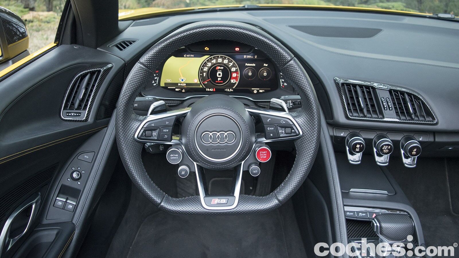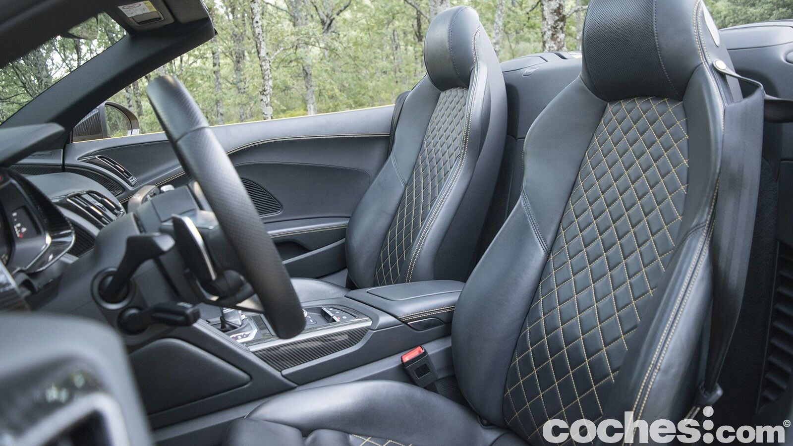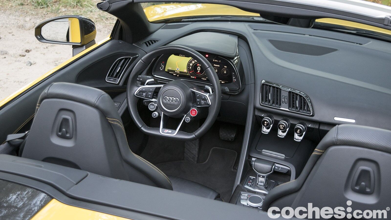 Por suerte lo suple con creces en cuanto a buenos ajustes y materiales de calidad. El habitáculo es simplemente sobresaliente, con todas las piezas bien ensambladas y sin que haya ningún elemento que destaque para mal. Por el contrario, la fibra de carbono y el cuero serán los claros protagonistas en este R8 Spyder. Mención especial a los espectaculares asientos deportivos que van en cuero negro con costuras en amarillo, a juego con nuestra unidad, y que no permitirán que nos movamos en las curvas.