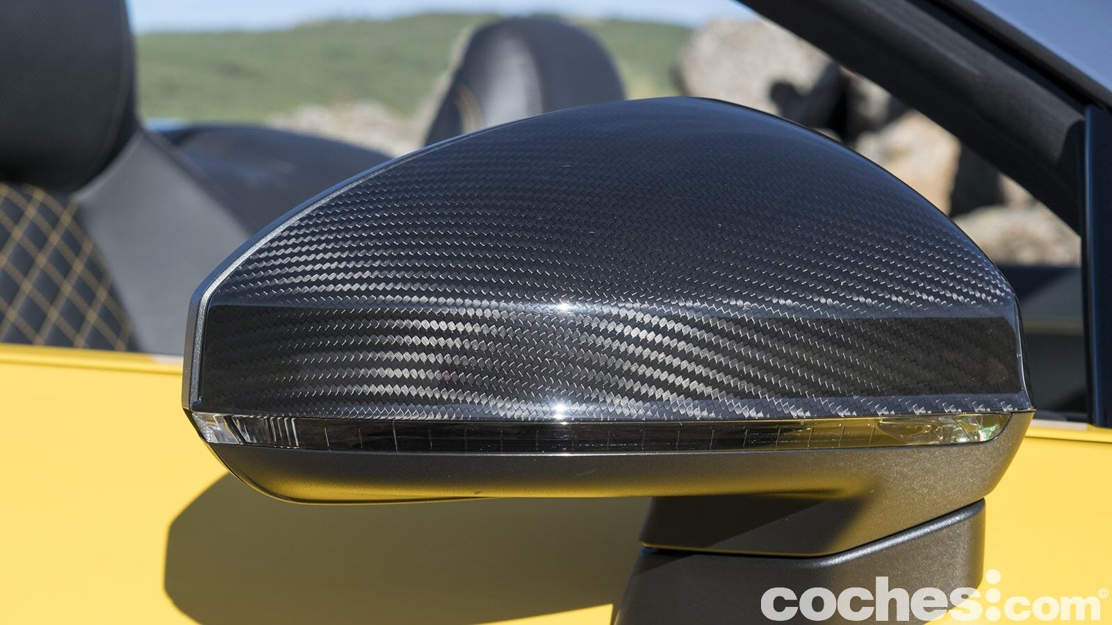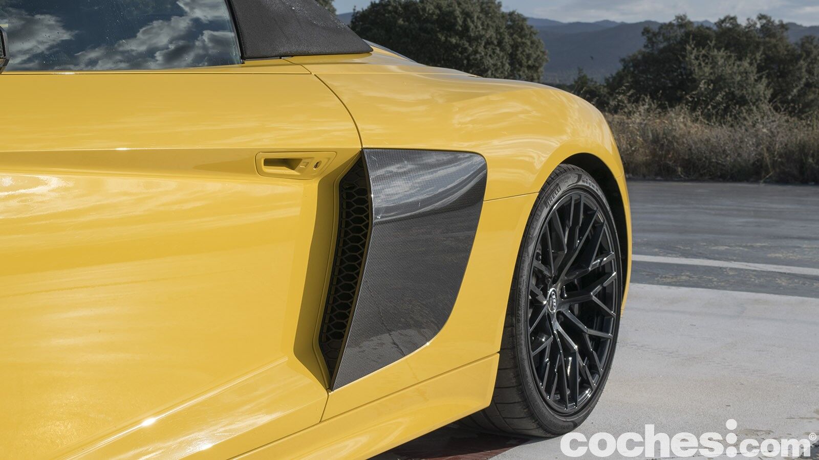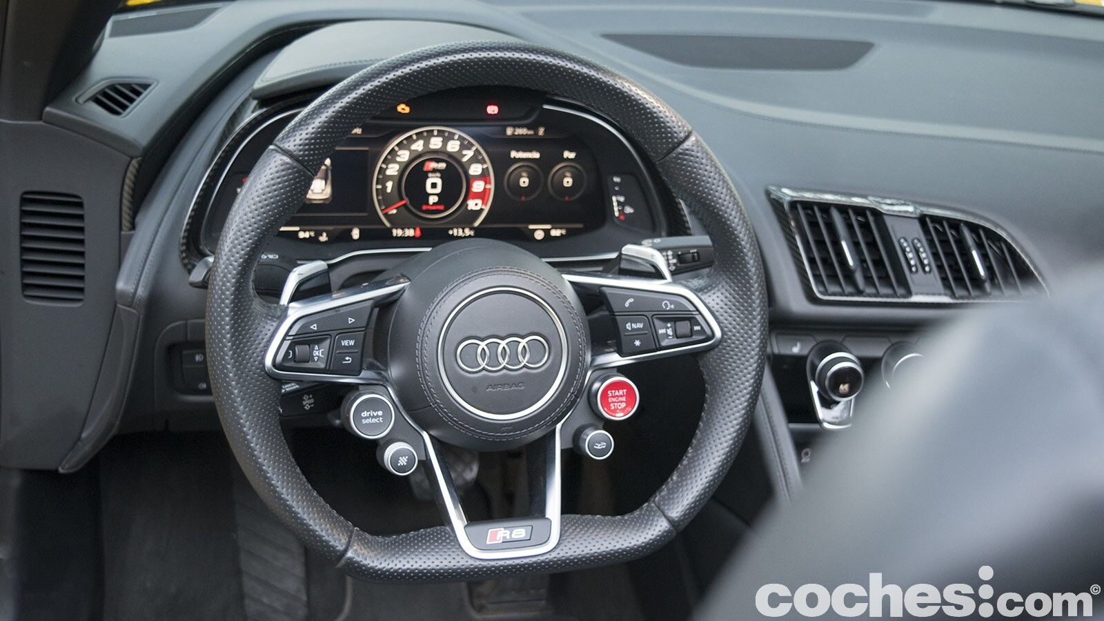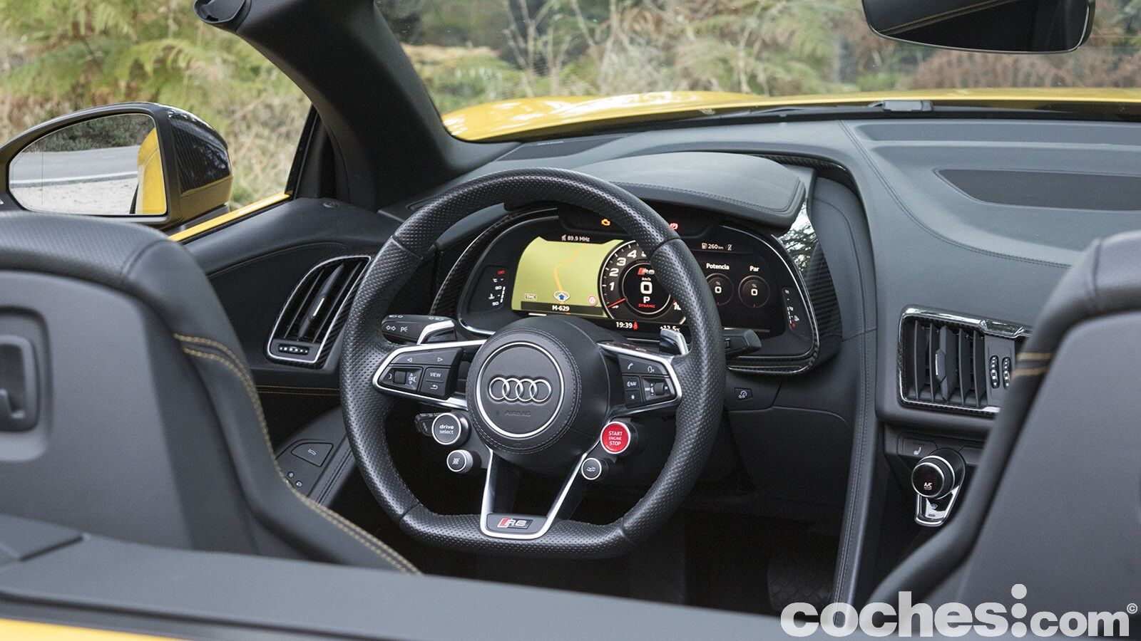 Por suerte lo suple con creces en cuanto a buenos ajustes y materiales de calidad. El habitáculo es simplemente sobresaliente, con todas las piezas bien ensambladas y sin que haya ningún elemento que destaque para mal. Por el contrario, la fibra de carbono y el cuero serán los claros protagonistas en este R8 Spyder. Mención especial a los espectaculares asientos deportivos que van en cuero negro con costuras en amarillo, a juego con nuestra unidad, y que no permitirán que nos movamos en las curvas.
