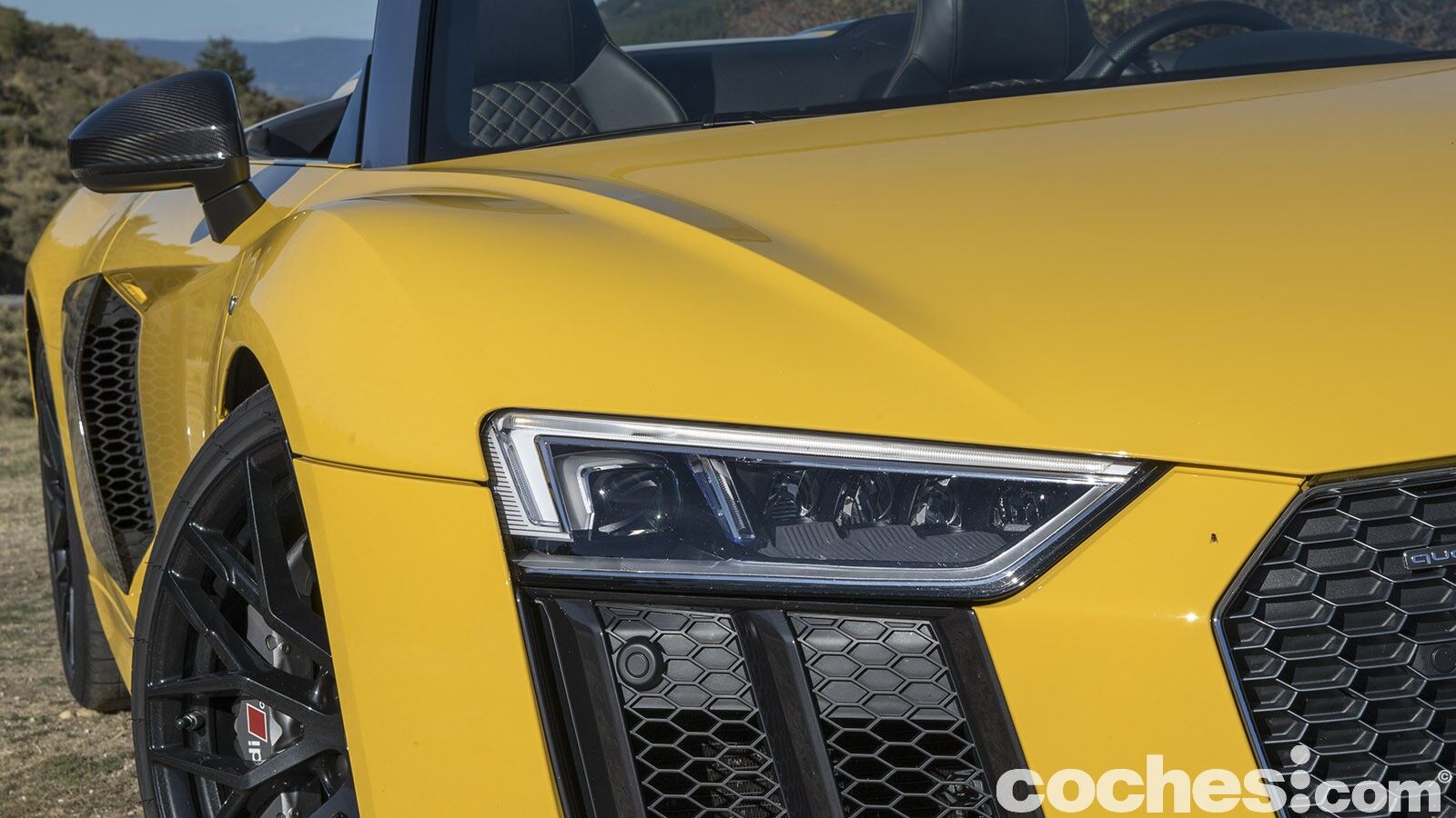 Desde mi punto de vista el principal acierto del R8 Spyder a nivel estético es su simplicidad y minimalismo. En el frontal destaca una enorme parrilla Singleframe hexagonal que integra la matrícula en su interior. El logotipo de los cuatro aros queda por encima, sobre el capó. A sus laterales se sitúan unos afilados faros láser (luego hablaremos de ellos) con una firma lumínica muy reconocible y unas tomas de aire con el mismo acabado de panal de abeja que tiene la parrilla. En la parte inferior del paragolpes sobresale un pequeño y elegante splitter de fibra de carbono.