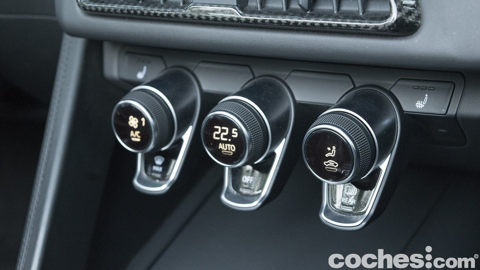 El salpicadero queda prácticamente despejado y ligeramente apuntando al conductor, único protagonista. Ahí se sitúan los controles de la climatización, con una disposición idéntica a la que presentó el Audi TT. Consiste en tres mandos circulares, uno para controlar la potencia, otro para la temperatura y el tercero para la zona. Hay que reconocer que esta solución nos parece una idea brillante, pero todavía cuesta asimilar que un modelo de esta categoría todavía tenga climatizador monozona.
