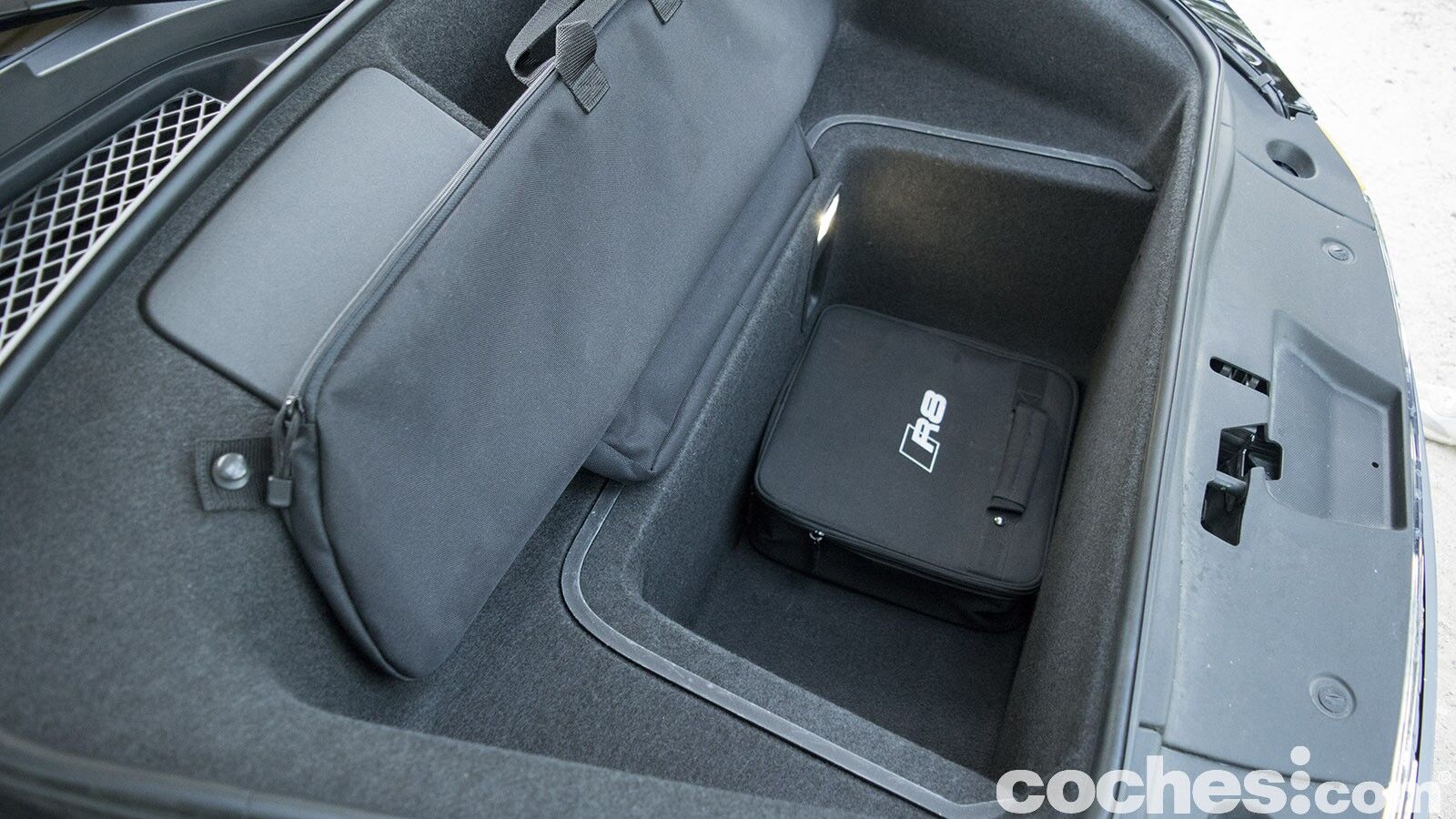 El Audi R8 Syder es un modelo con un motor de alta cilindrada colocado en posición central. Esto quiere decir que nos tenemos que olvidar de que el maletero esté en su ubicación habitual. Lo encontraremos si levantamos el capó delantero y lógicamente no podremos esperar un demasiado espacio. Este hueco tiene una capacidad de apenas 112 litros, sin duda uno de los más pequeños que podamos encontrar en el mercado.