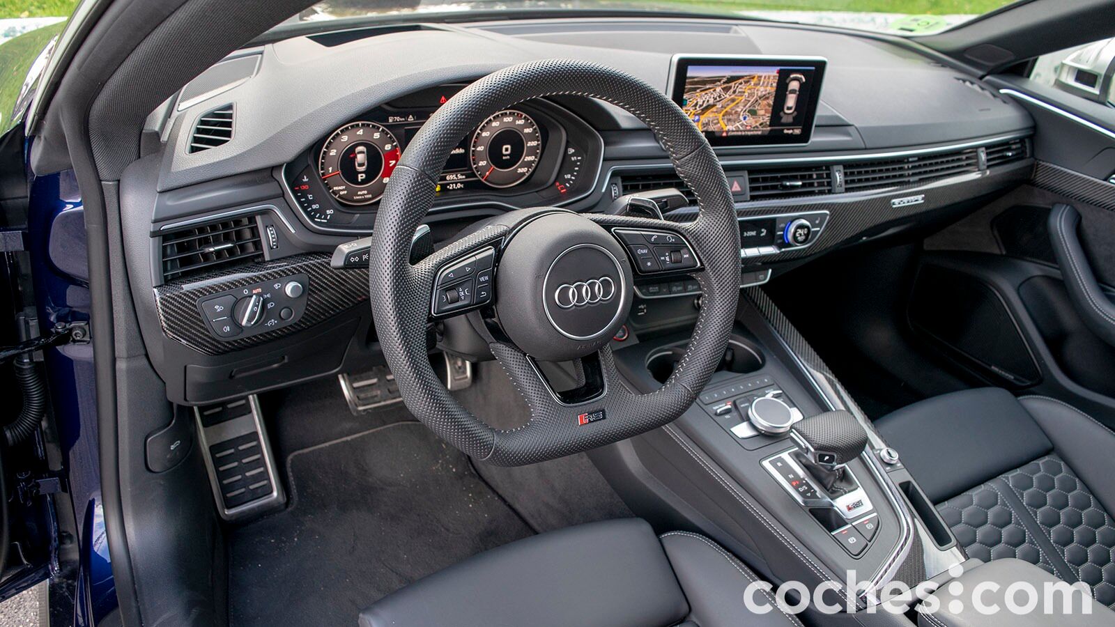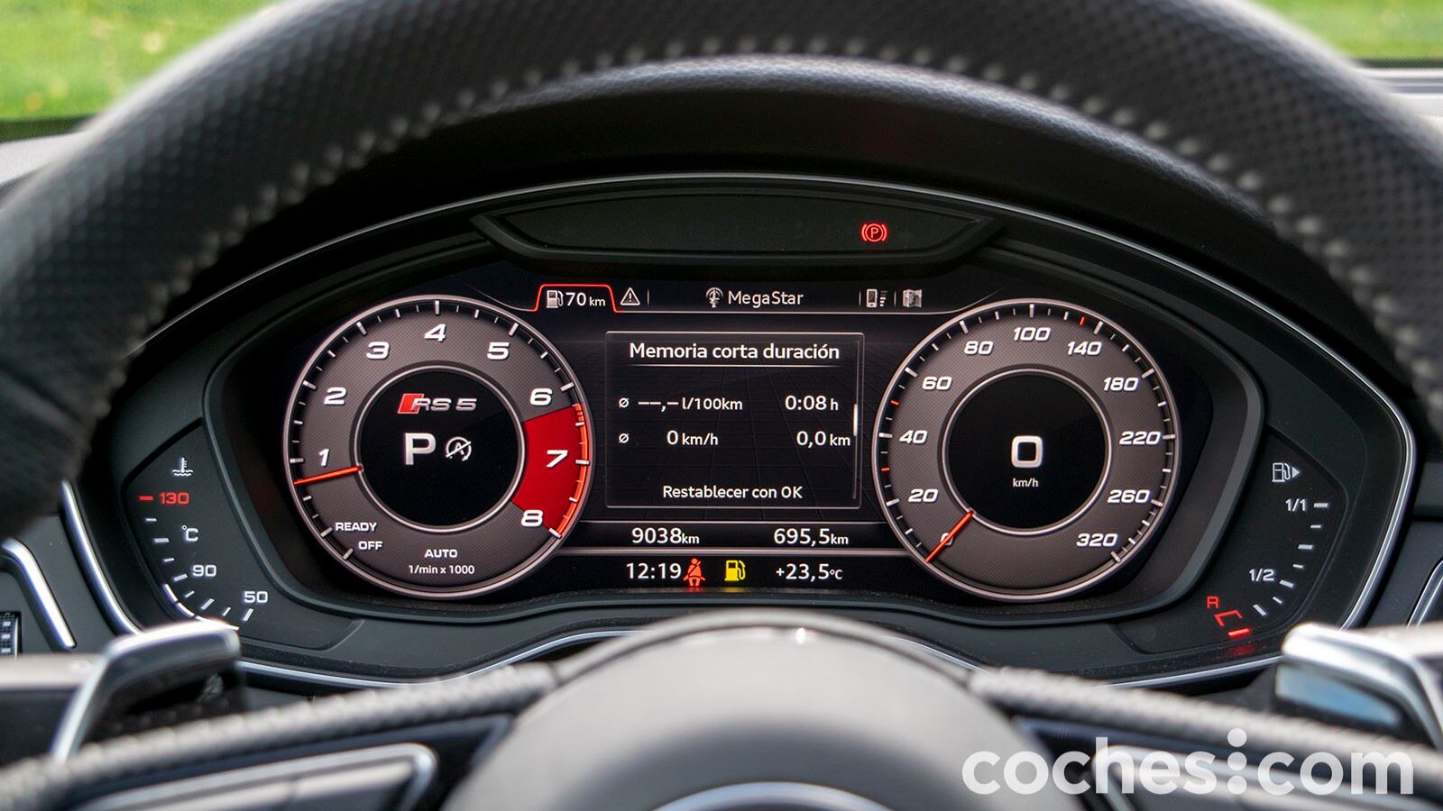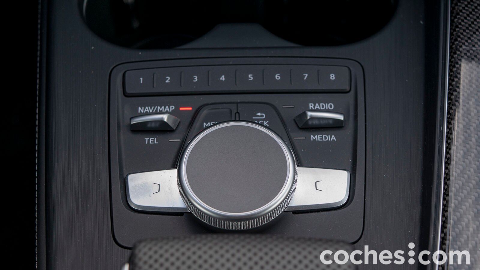 El interior del Audi RS 5 Sportback se mantiene en un nivel de digitalización medio. Con esto queremos decir que no cuenta con el MMI touch response con su configuración de doble pantalla que ya está presente a partir del A6. En este caso se mantiene una pantalla principal de 8,3 pulgadas que sobresale en el salpicadero. La peculiaridad es que se controla la ruleta táctil en la consola central, algo que tiene ventajas (no desvía demasiado la atención) y desventajas (necesidad de aprendizaje).