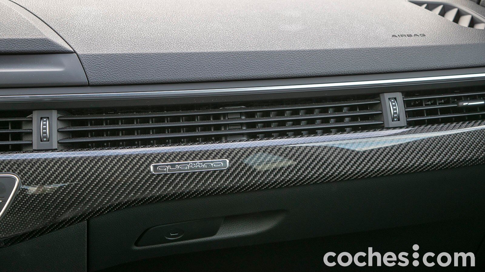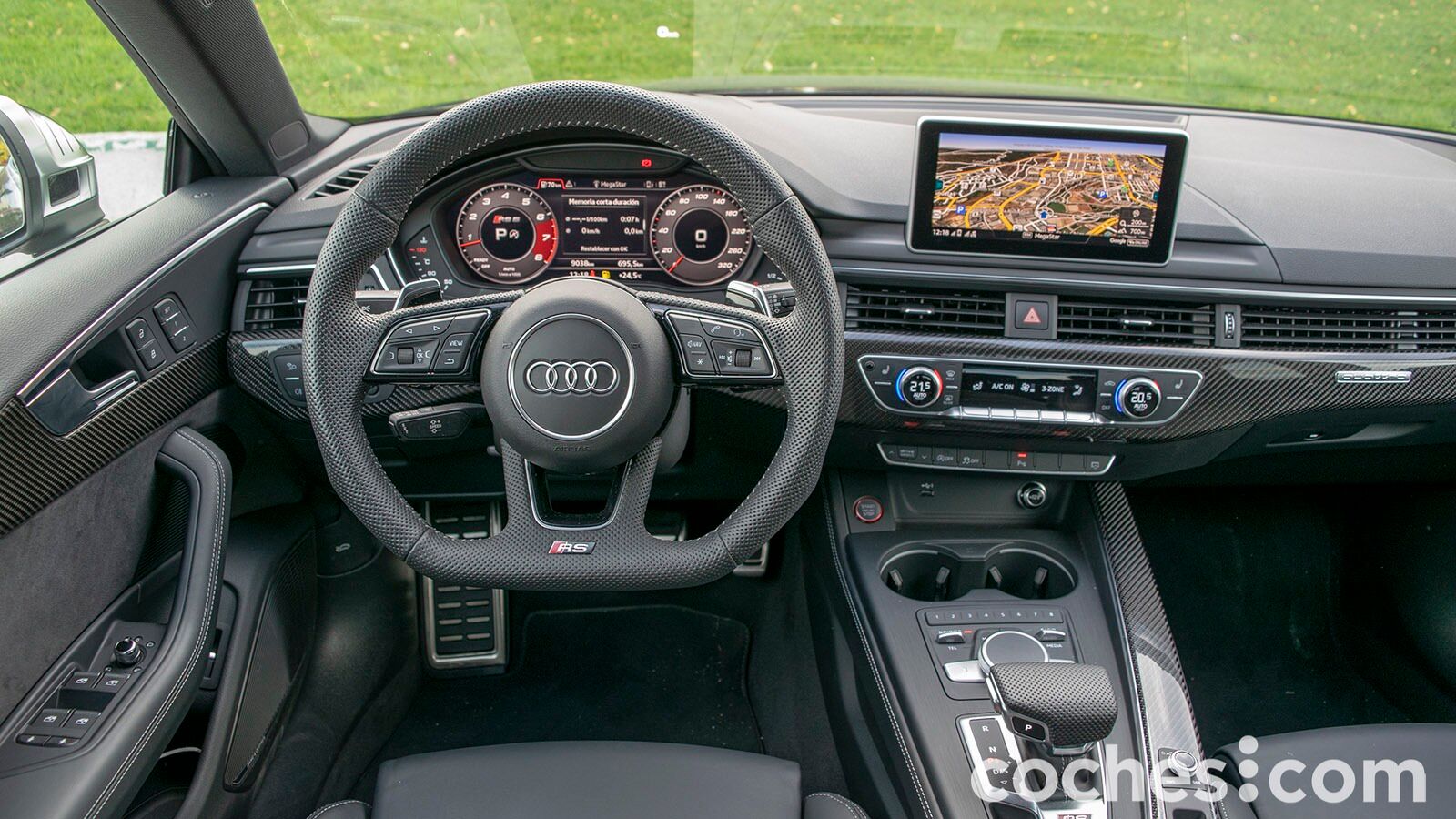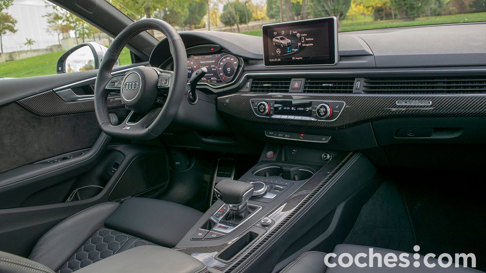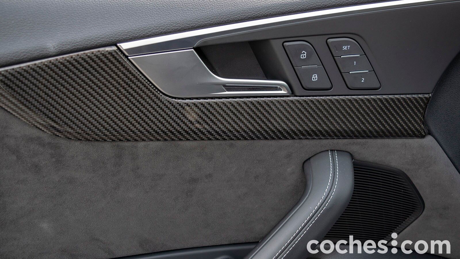 Dejando a un lado la tecnología, hay que destacar la calidad percibida del RS 5 Sportback. Ya hablaríamos bien de un A5 convencional y en este caso se acentúa en el tope de gama. Los materiales empleados son notables, destacando especialmente las distintas molduras de fibra de carbono (consola central, salpicadero y puertas), la tapicería de cuero con costuras en contraste (asientos, volante, puertas...) o el Alcántara (aparece en puertas y techo).