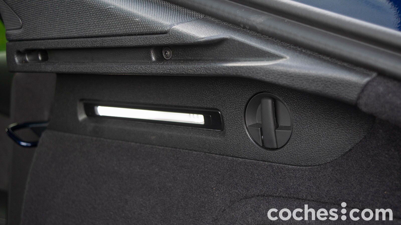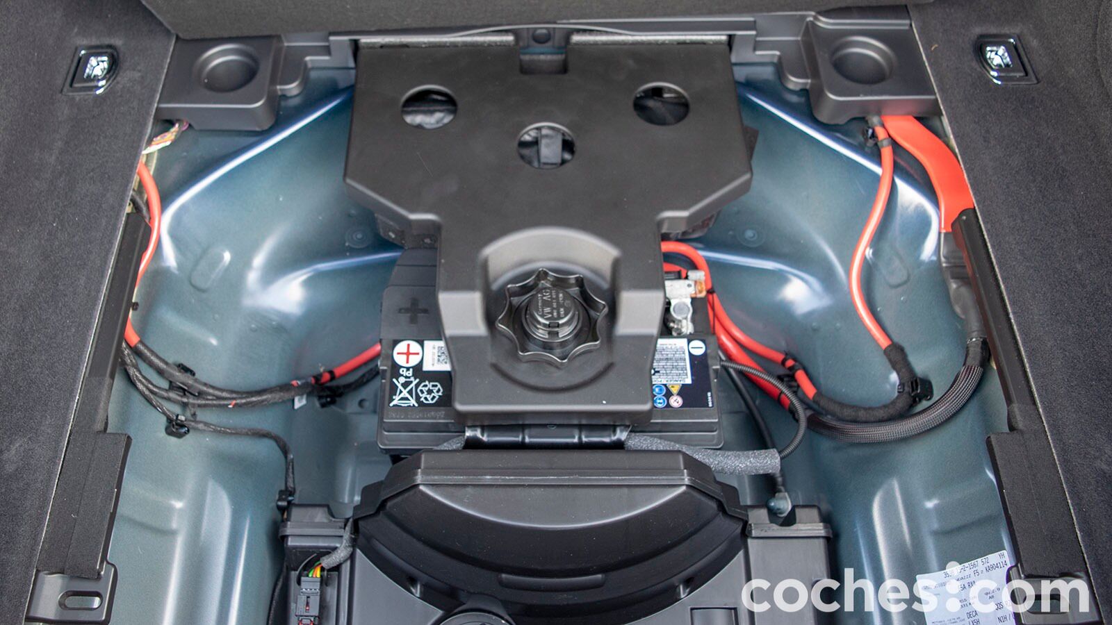 A los laterales hay dos huecos para dejar objetos pequeños con unas redes. También habrá ganchos y una red de mayor tamaño para dividir la carga en este maletero. Bajo el piso no hay espacio para una rueda de repuesto (tenemos la batería), así que en su lugar encontramos el kit antipinchazos. Si necesitamos más espacio tenemos la posibilidad de abatir los asientos traseros en dos partes (60:40) para conseguir una superficie plana y mucha más capacidad.