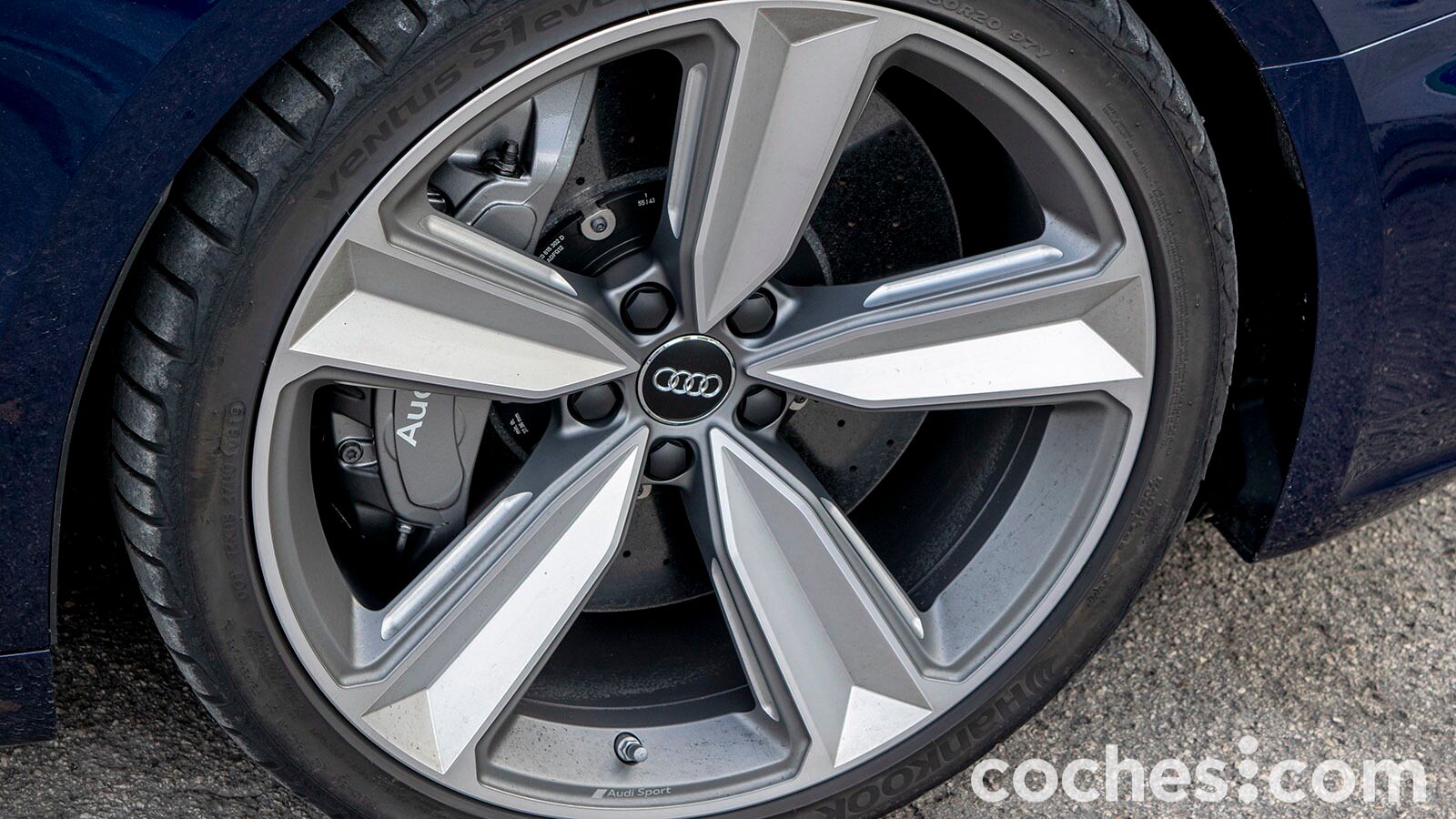 En el lateral se puede apreciar bien la berlina de cinco puertas que distingue a este Sportback. Quiere mantener la silueta coupé del A5 mediante la caída del techo y las puertas adicionales están bien integradas. Destacar el marco cromado que rodea a las ventanillas y los detalles RS de esta versión. Es imposible que pasen desapercibidas las llantas de 20 pulgadas de Audi Sport con cinco radios y pinzas de freno plateadas. En este caso también hay unas taloneras más pronunciadas.