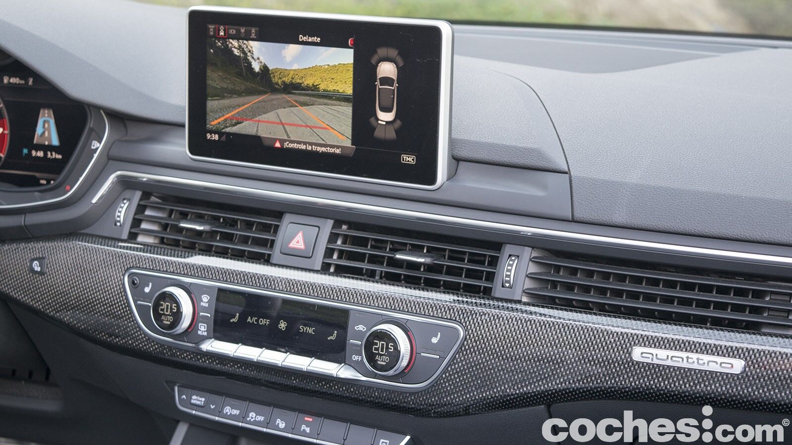 En el interior se respira una atmósfera de tecnología y calidad sin igual. Cuenta con todos los sistema que se introdujeron con la quinta generación del Audi A4 y esto no es moco de pavo. Sobresaliendo por encima del salpicadero tenemos una pantalla de 8,3 pulgadas que donde se concentran las funciones del sistema multimedia MMI Navegación Plus. La pantalla no es táctil, los controles se ejercen desde una ruleta en la consola central que sí tiene una superficie táctil.