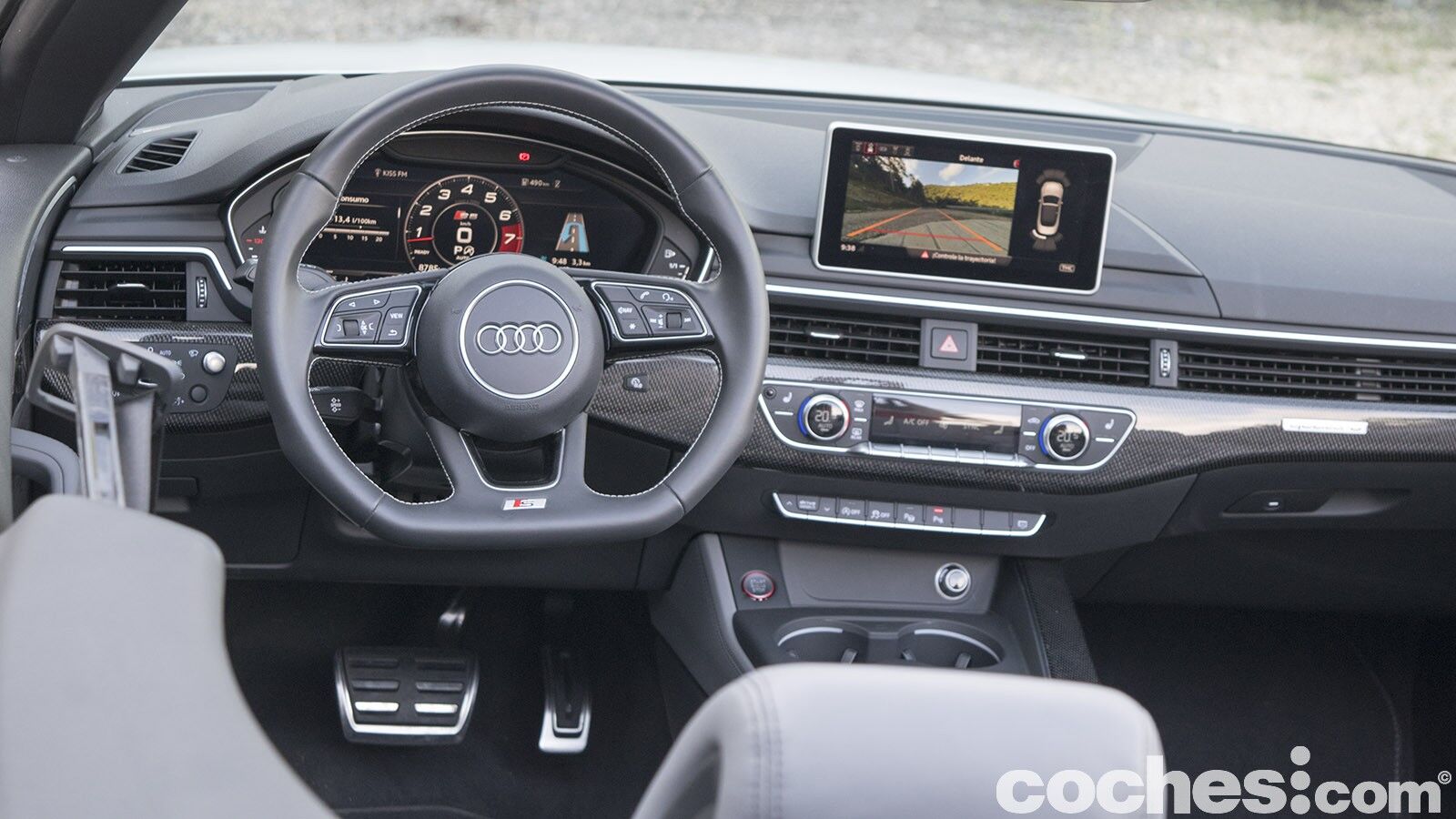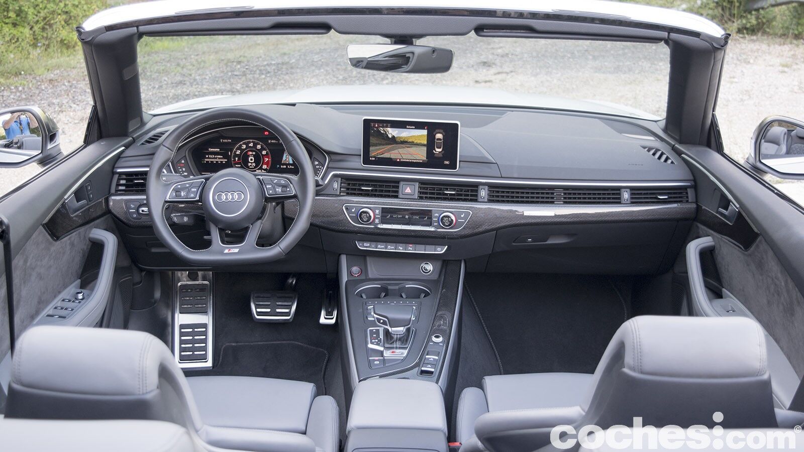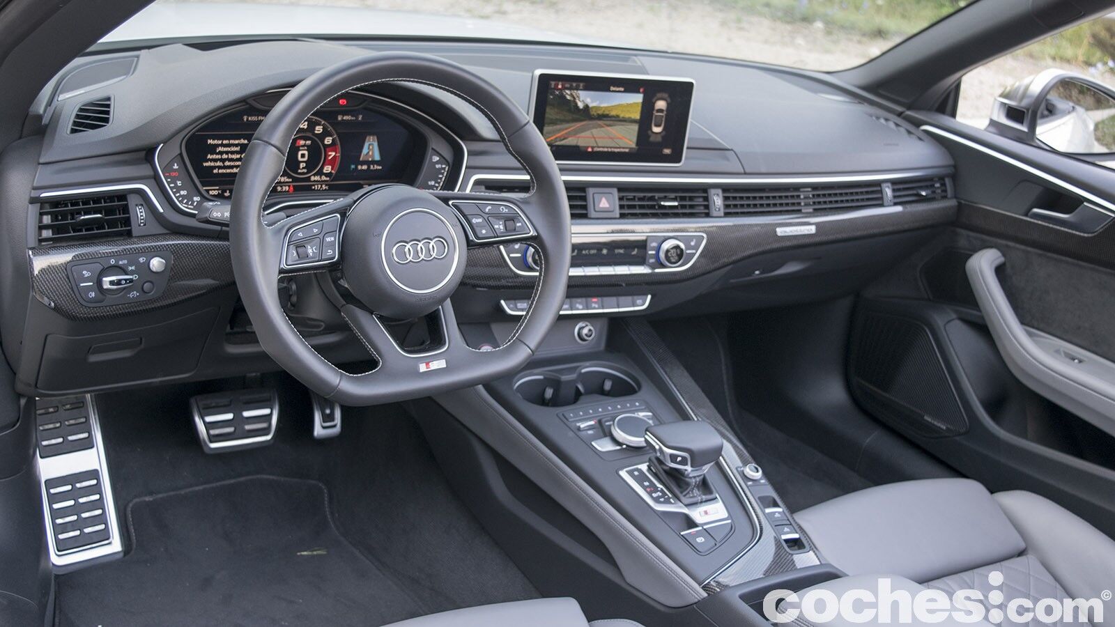El S5 Cabrio se trata de un premium de verdad, por todos es sabido el buen hacer de la firma de los cuatro aros en los habitáculos. El ajuste de todos sus elementos es sobresaliente y la calidad de los mismos también lo es. Cabe destacar esa moldura de fibra de carbono que surca el salpicadero y que se extiende a las puertas y a la parte baja de la consola central. La tapicería de cuero que cubre los asientos con patrón de diamantes también es exquisita.