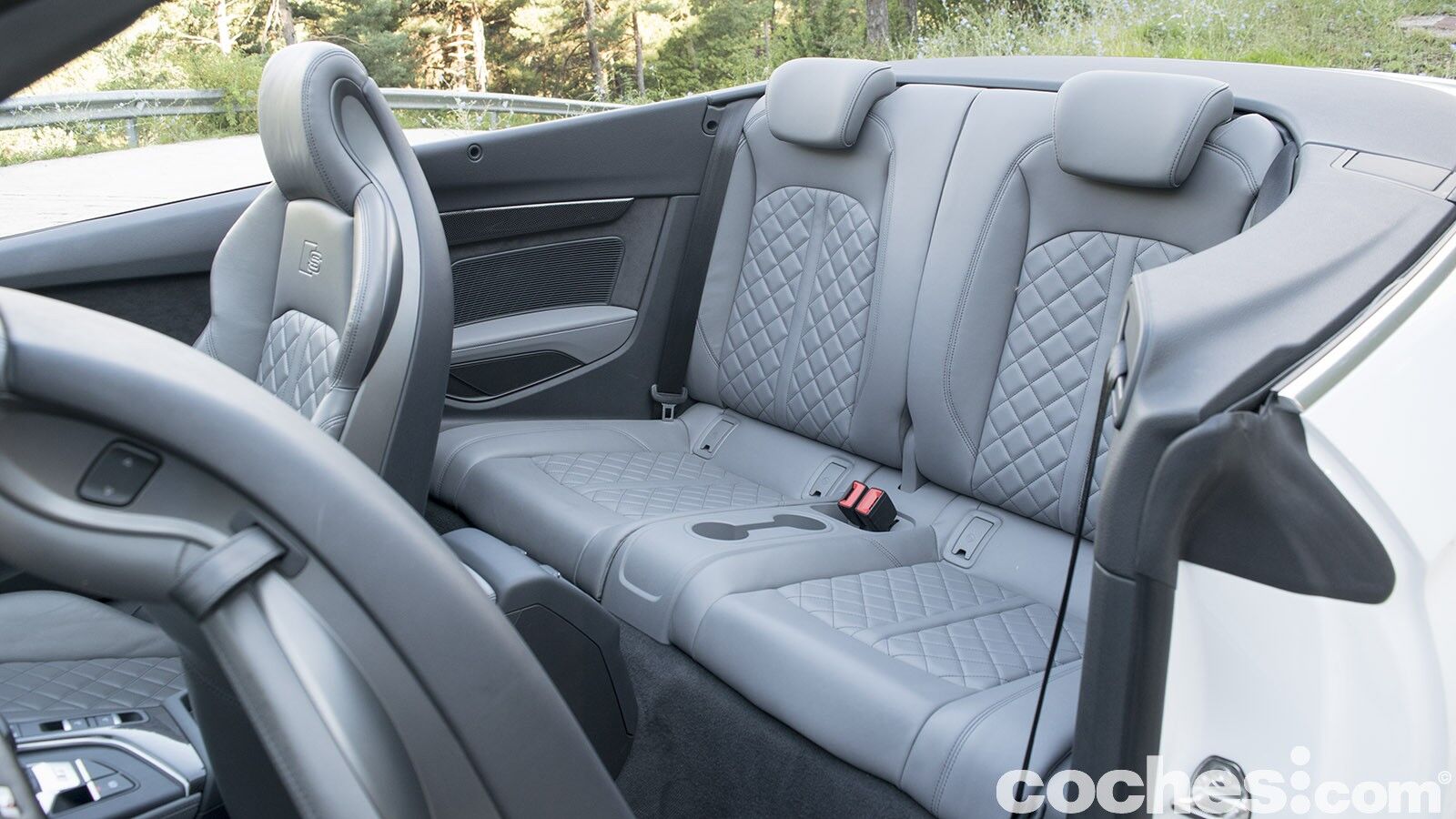 Pero las plazas traseras son otro cantar. El S5 Cabrio es un 2+2 puro y menos mal, porque no hay espacio físico para una quinta plaza. Cuanto el coche va descapotado el acceso es cómodo gracias al ajuste eléctrico de los asientos delanteros y hay bastante espacio de anchura y para las piernas, siempre que los de delante no vayan en una posición muy retrasada. Pero con la capota puesta el acceso es bastante complicado y los más altos notaran chocar su cabeza contra la lona. Inconvenientes de tener un cabrio...