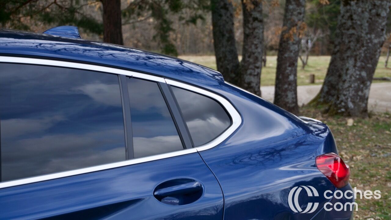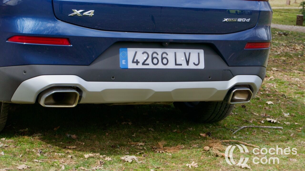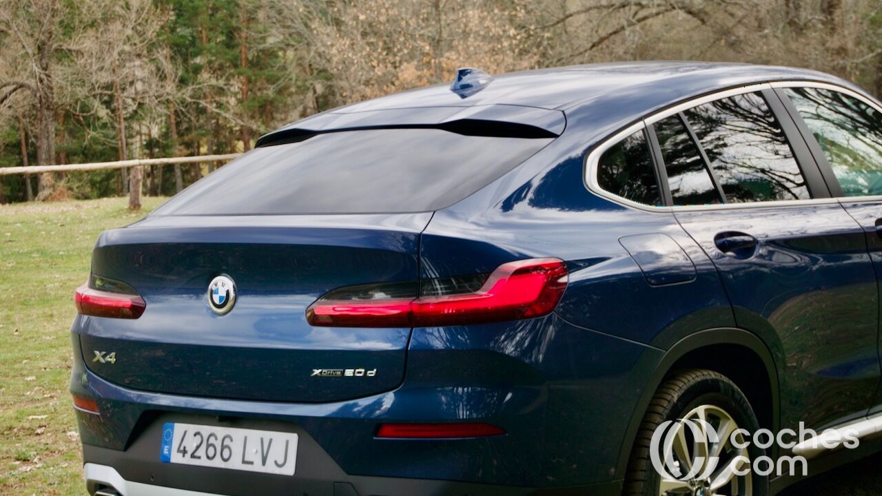 En la zaga continúa esa diferenciación y gana enteros gracias a la luneta inclinada y, sobre todo, a unos pilotos traseros horizontales y alargados. Quedan por debajo de una especie de spoiler que se forma en el portón del maletero y se introducen ligeramente en el lateral. Por otro lado, el BMW X4 también cuenta con un paragolpes trasero específico con embellecedores para los tubos de escape, que son más grandes y quedan enrasados.