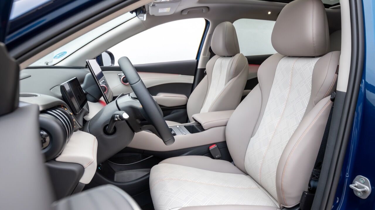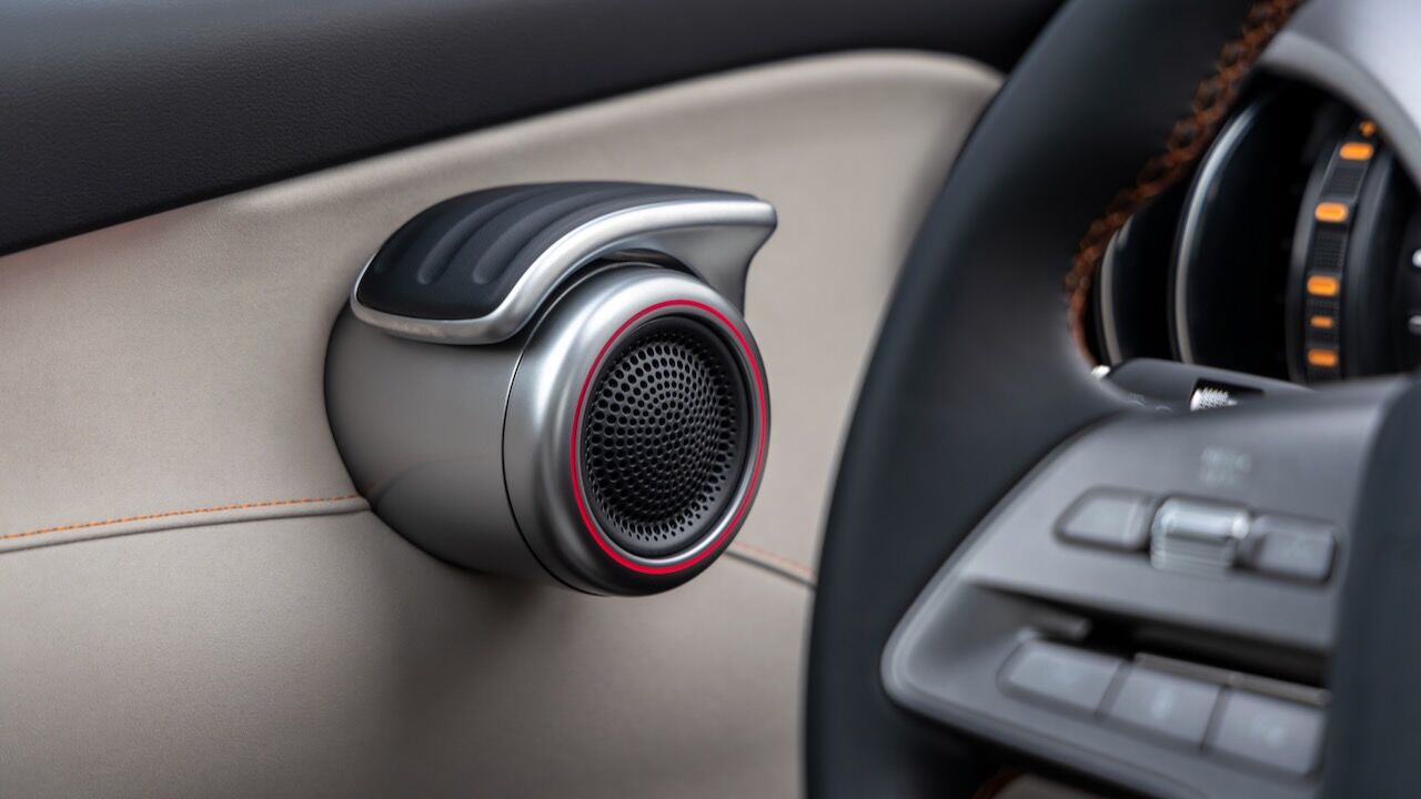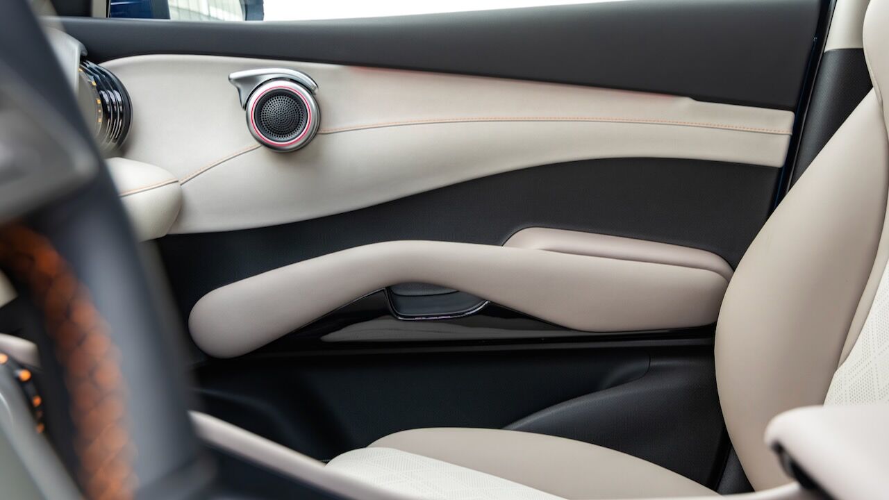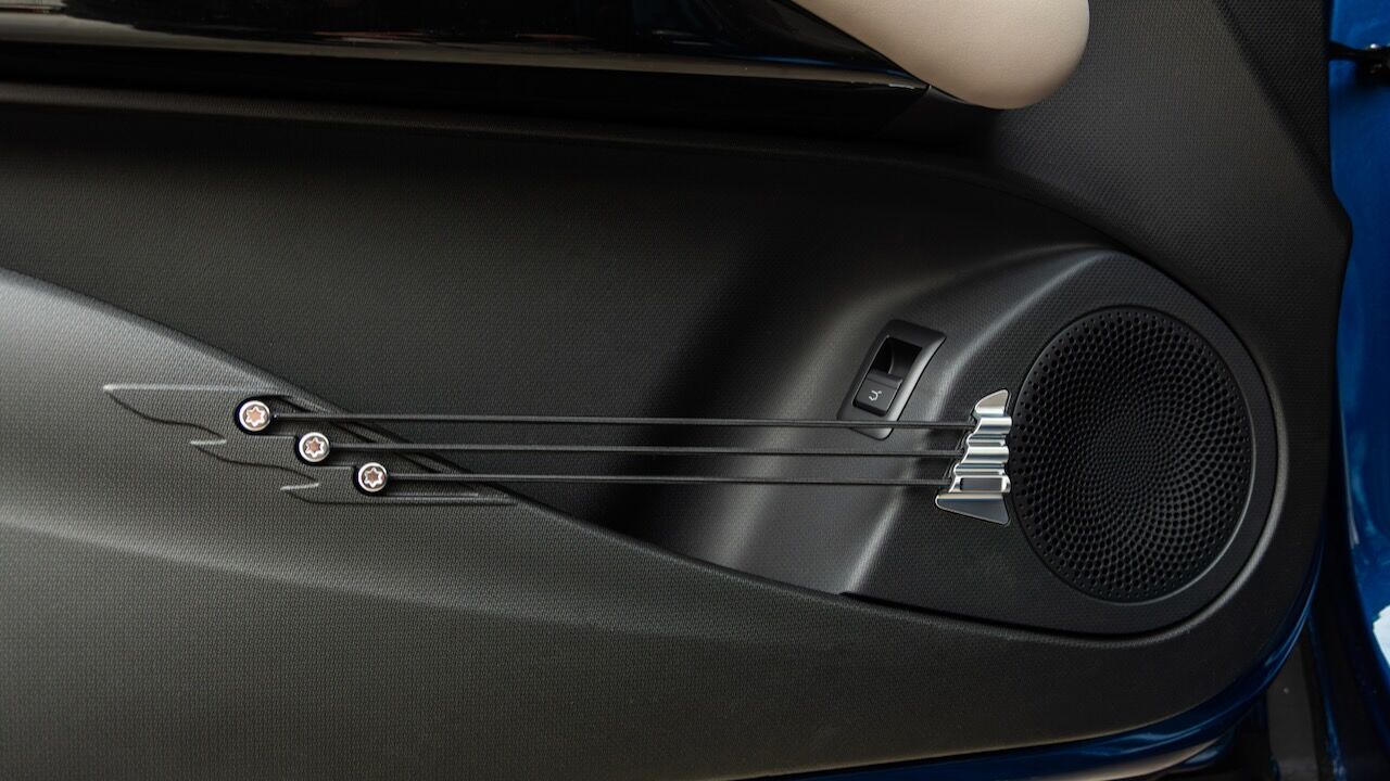 La calidad de construcción y los materiales empleados logran transmitir una sensación bastante premium. Toda la cabina está revestida con una agradable tapicería de cuero y adornada con un sistema de iluminación ambiental dinámico que puede moverse incluso al ritmo de la música. Además, los diseñadores han conservado los toques más originales del modelo de partida, como los tiradores de las puertas giratorios y los característicos tensores elásticos en los compartimentos inferiores que simulan las cuerdas de una guitarra.