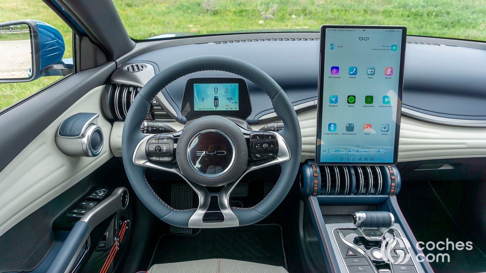 Cuando pasamos al interior de la mayoría de coches nos invade cierta sensación similar a la del «Día de la Marmota». Cada vez son más parecidos y la digitalización ha llevado a que tengamos un par de pantallas y poco más. Sin embargo, BYD ha querido hacerlo de forma muy diferente, con detalles de diseño realmente exclusivos. Lo decimos por esas formas del salpicadero envolvente, por las salidas del aire acondicionado, por el selector de marcha con inspiración aeronáutica, por los tiradores de las puertas circulares o por esas cuerdas de guitarra que están en las puertas (y que suenan).