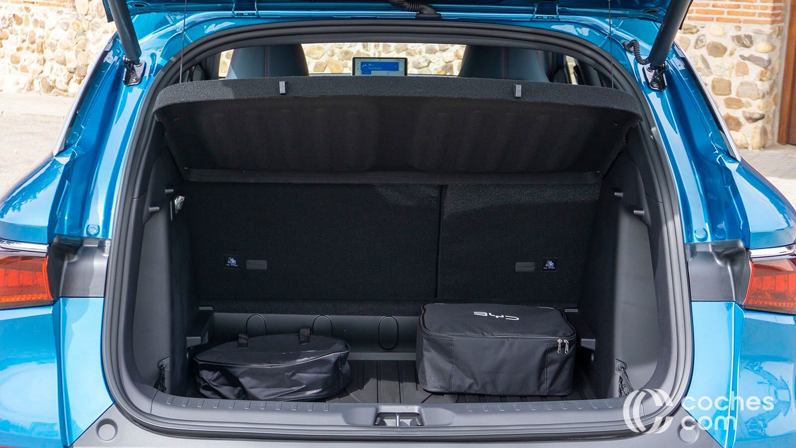 El maletero está ligeramente por encima de la media gracias a sus 440 litros de capacidad. Lo cierto es que perdemos algo debido a lo que ocupan los cables de carga, pero está mejor que en otros eléctricos. También tiene algo de iluminación, pero no ganchos para fijar la carga. Por otro lado, ofrece la posibilidad de tener un portón de apertura eléctrica.