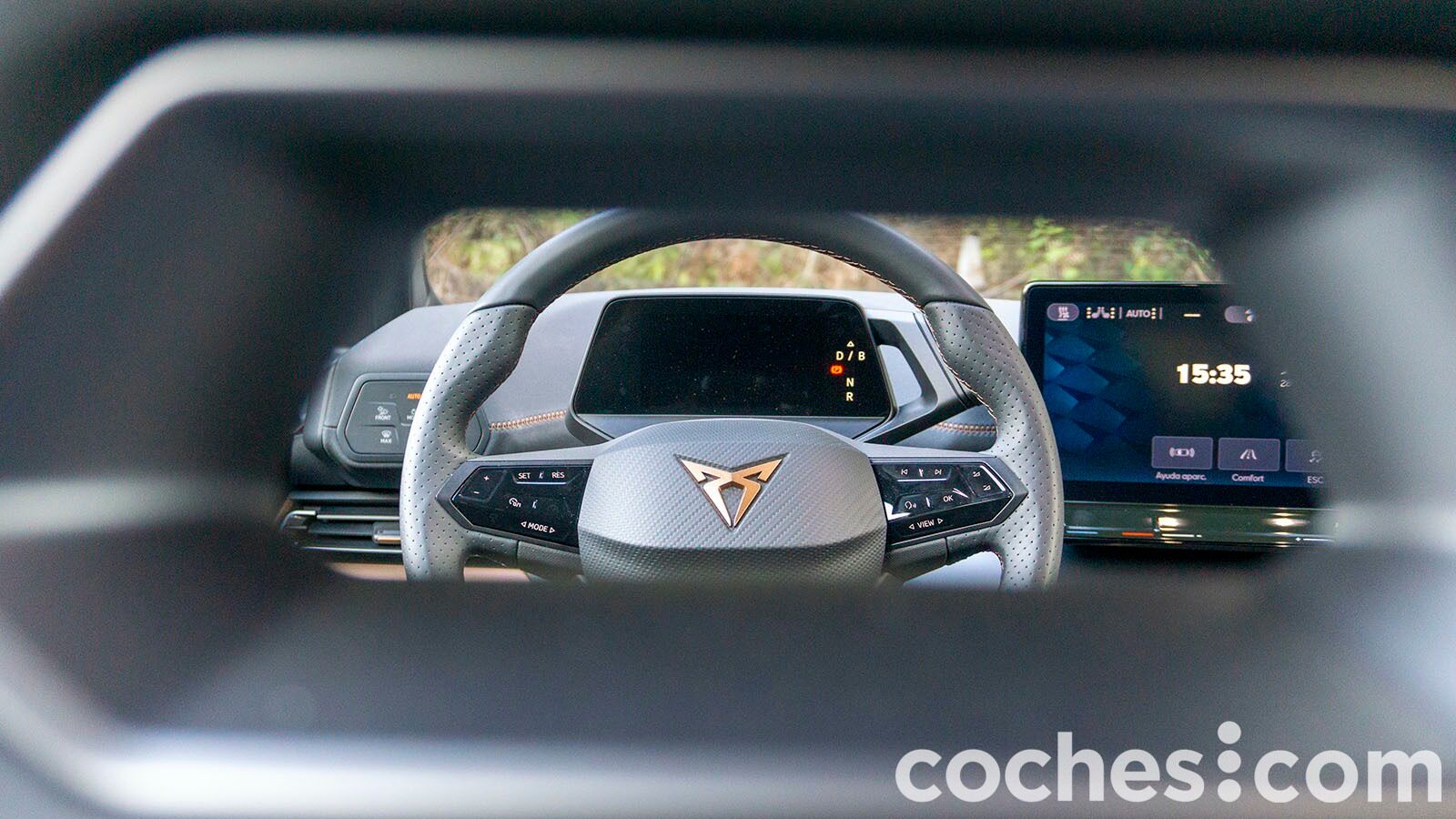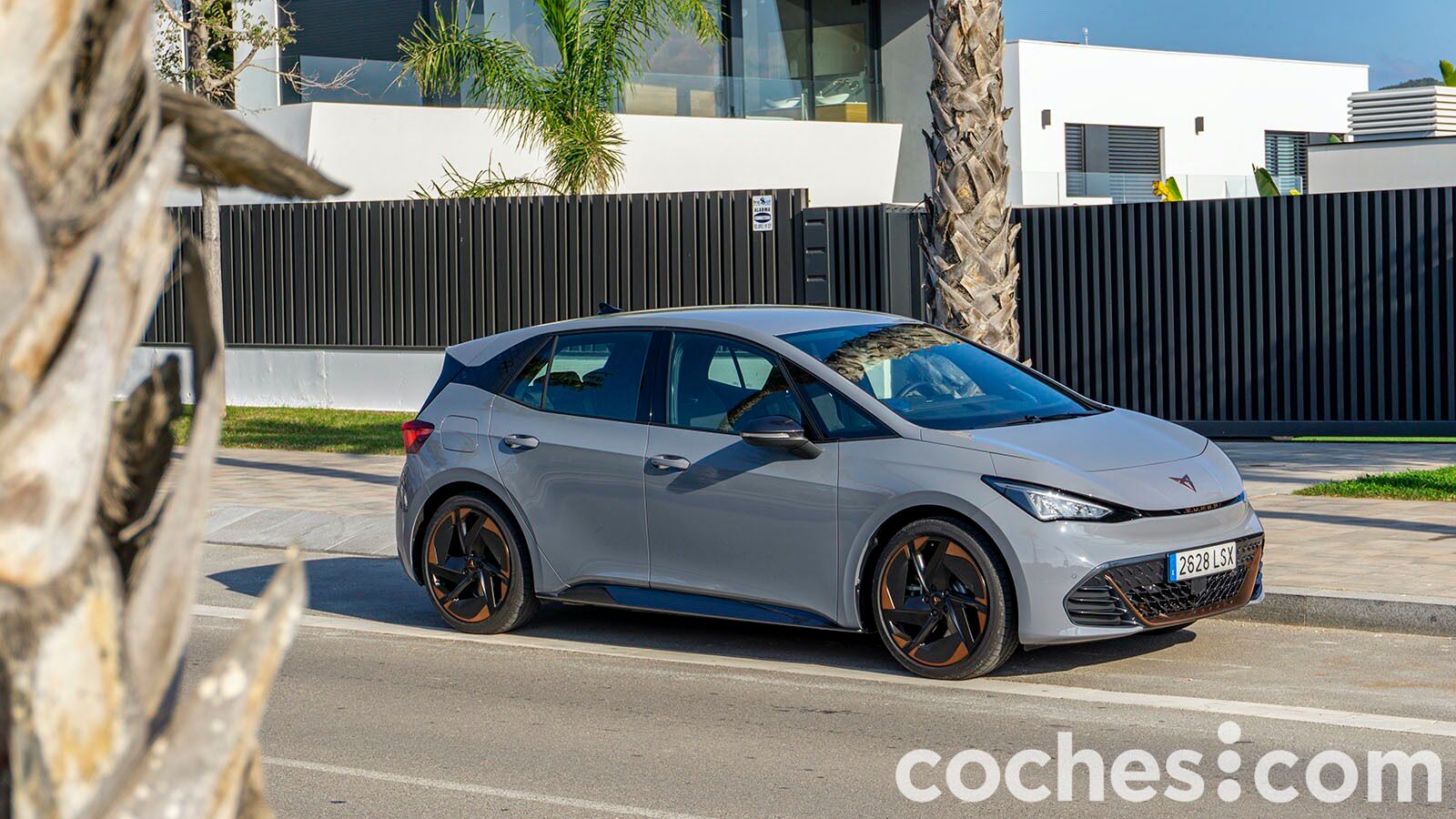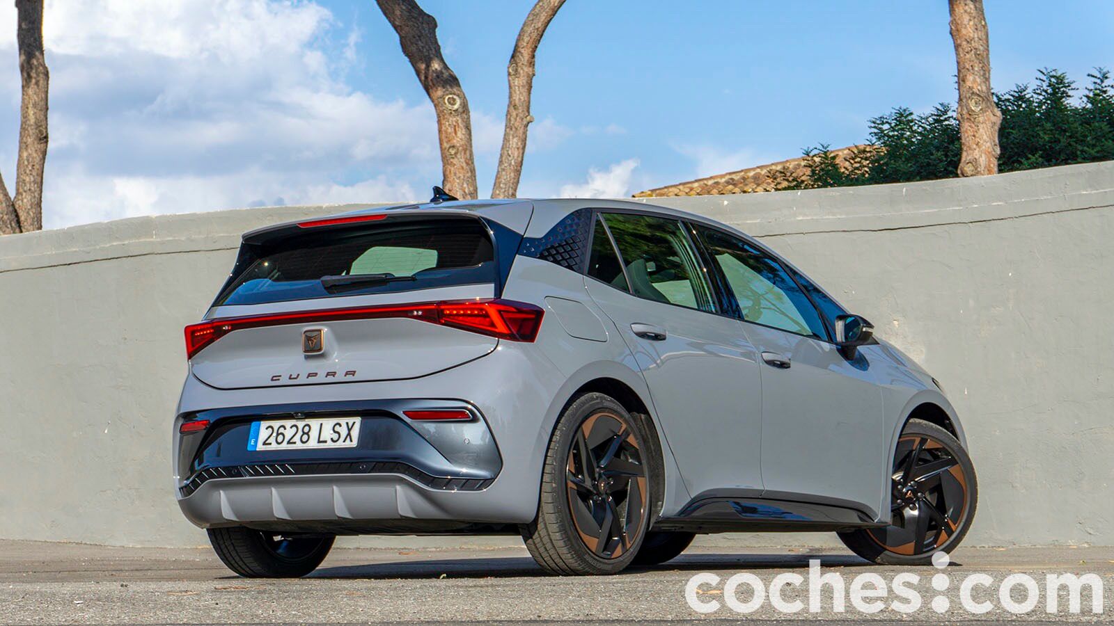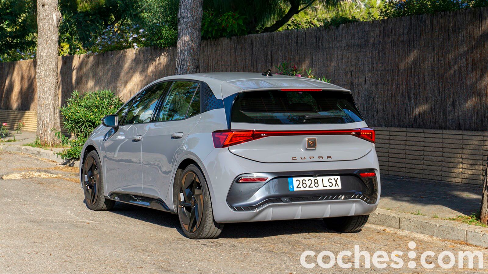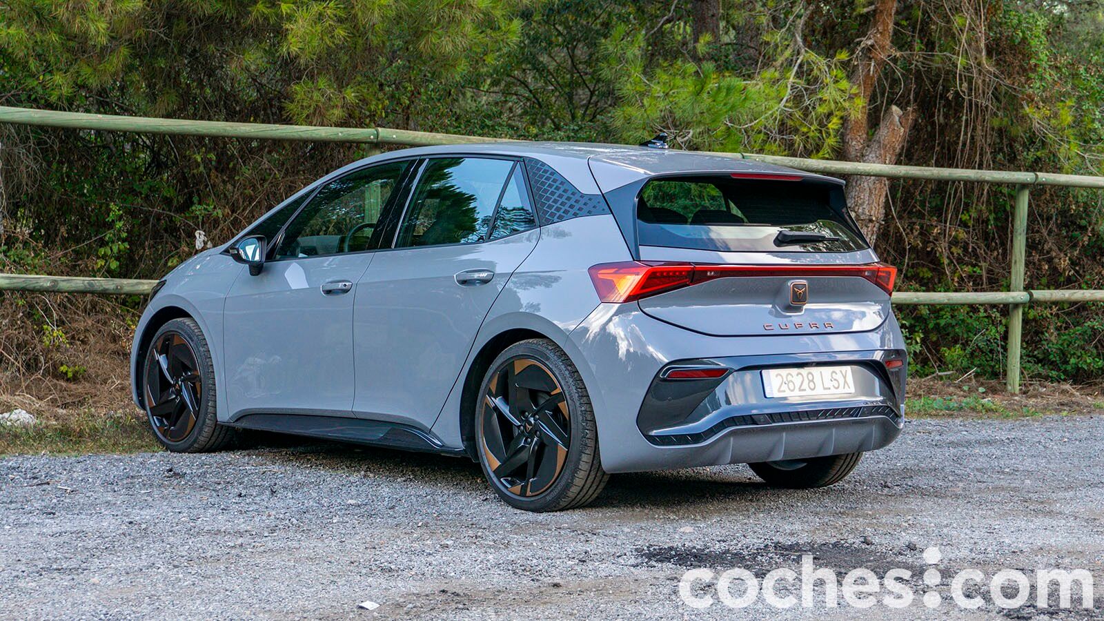 Porque como buen Cupra, este modelo consigue un comportamiento dinámico bastante conseguido para ser un eléctrico. Ya de serie cuenta con detalles como una dirección progresiva que consigue un tacto más natural. Sigue siendo demasiado asistida y no transmite tanto como nos gustaría, pero es mejor que la que tienen otros rivales. Aunque la clave en este modelo es la suspensión rebajada, que es 15 mm más baja delante y 10 mm más baja detrás respecto a otros modelos con la plataforma MEB.