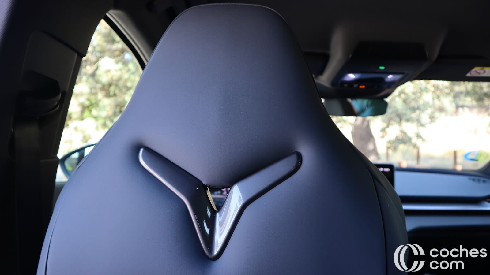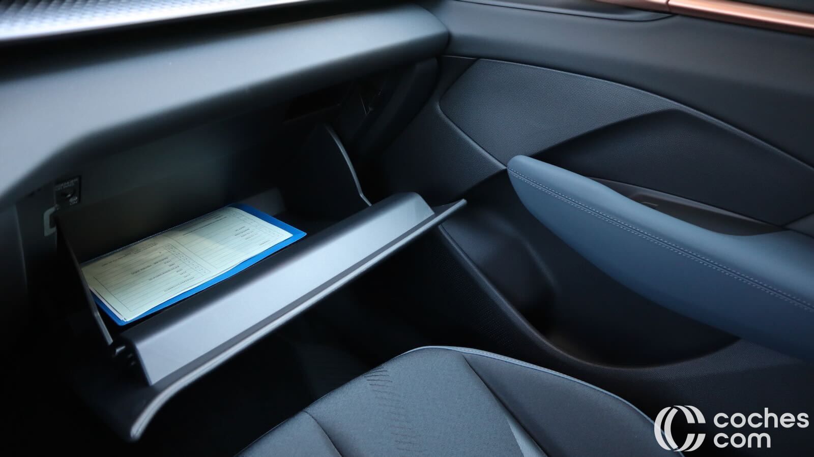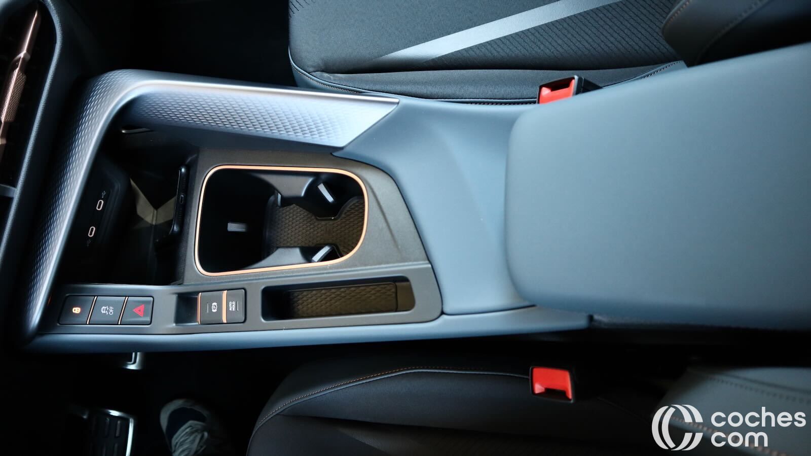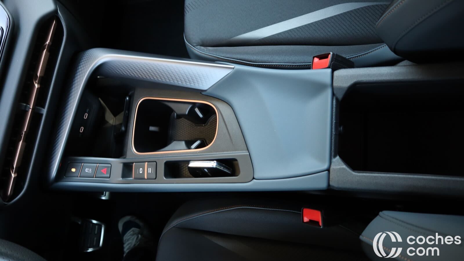 La consola central no es tan espectacular como la espina dorsal del Tavascan, pero recuerda ligeramente y es práctico. El selector del cambio está en un mando tras el volante y libera espacio en esa zona, donde encontramos algunos mandos, base de carga inalámbrica, un par de reposavasos y un cofre bajo el reposabrazos. Se puede mover hacia arriba pero es una pena que no longitudinalmente, a algún conductor le puede quedar algo retrasado.
