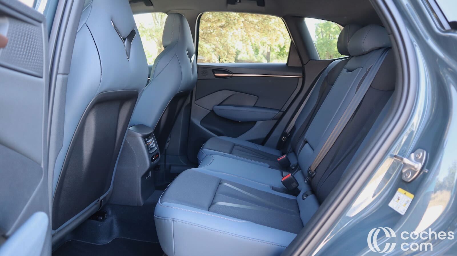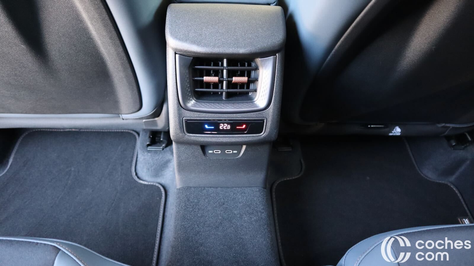Además, cuenta con una banqueta trasera que puedes desplazar longitudinalmente unos 15 cm, puedes reclinar los respaldos ligeramente para viajar más cómodo y tenemos salidas para la climatización, en las que se puede variar la temperatura además del caudal y un par de tomas USB-C para los pasajeros traseros.