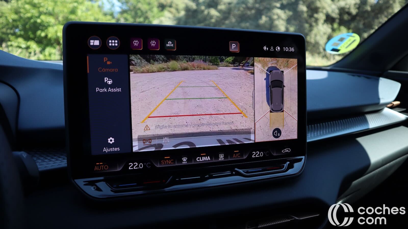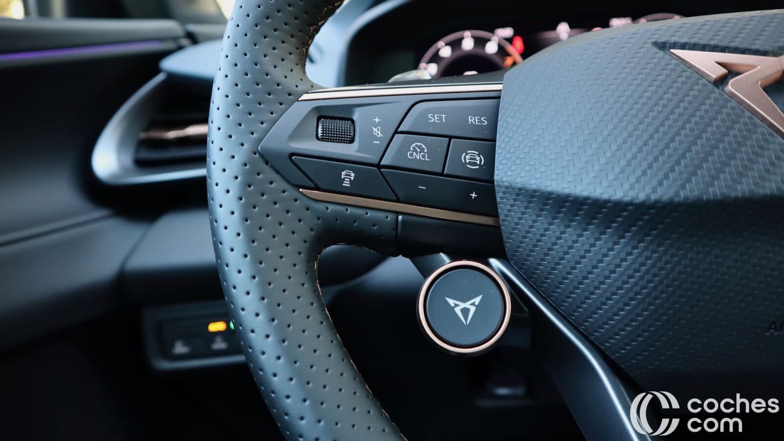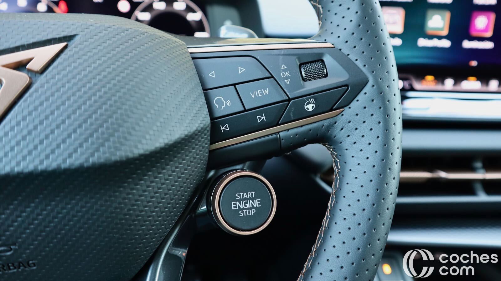En los la parte delantera tenemos varias cosas en común con otros CUPRA, como el volante, con mandos bien distribuidos, tanto botones físicos como ruletas y dos botones integrados, para arrancar el coche y otro para seleccionar los modos de conducción.